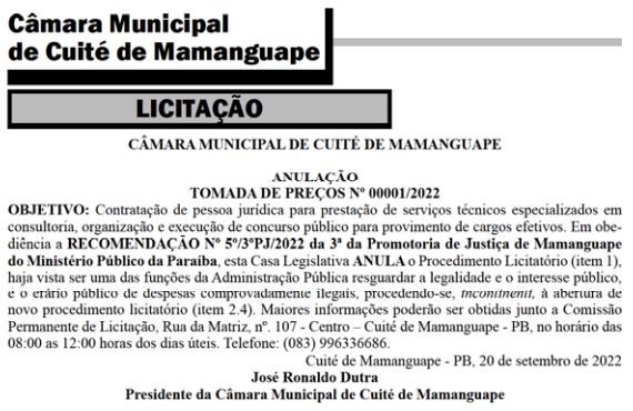 De acordo com o texto, ocorreu a anulação da tomada de preços Nº 00001/2022. “Em obedicência a recomendação Nº 5º/3ºPJ/2022 da 3ª Promotoria de Justiça de Mamanguape do Ministério Público da Paraíba, esta casa legislativa anula o processo licitatório (item 1), haja vista ser uma das funções da Administração Pública resguardar a legalidade e o interesse público, e o erário público das despesas comprovadamente legais”, diz trecho do conteúdo.