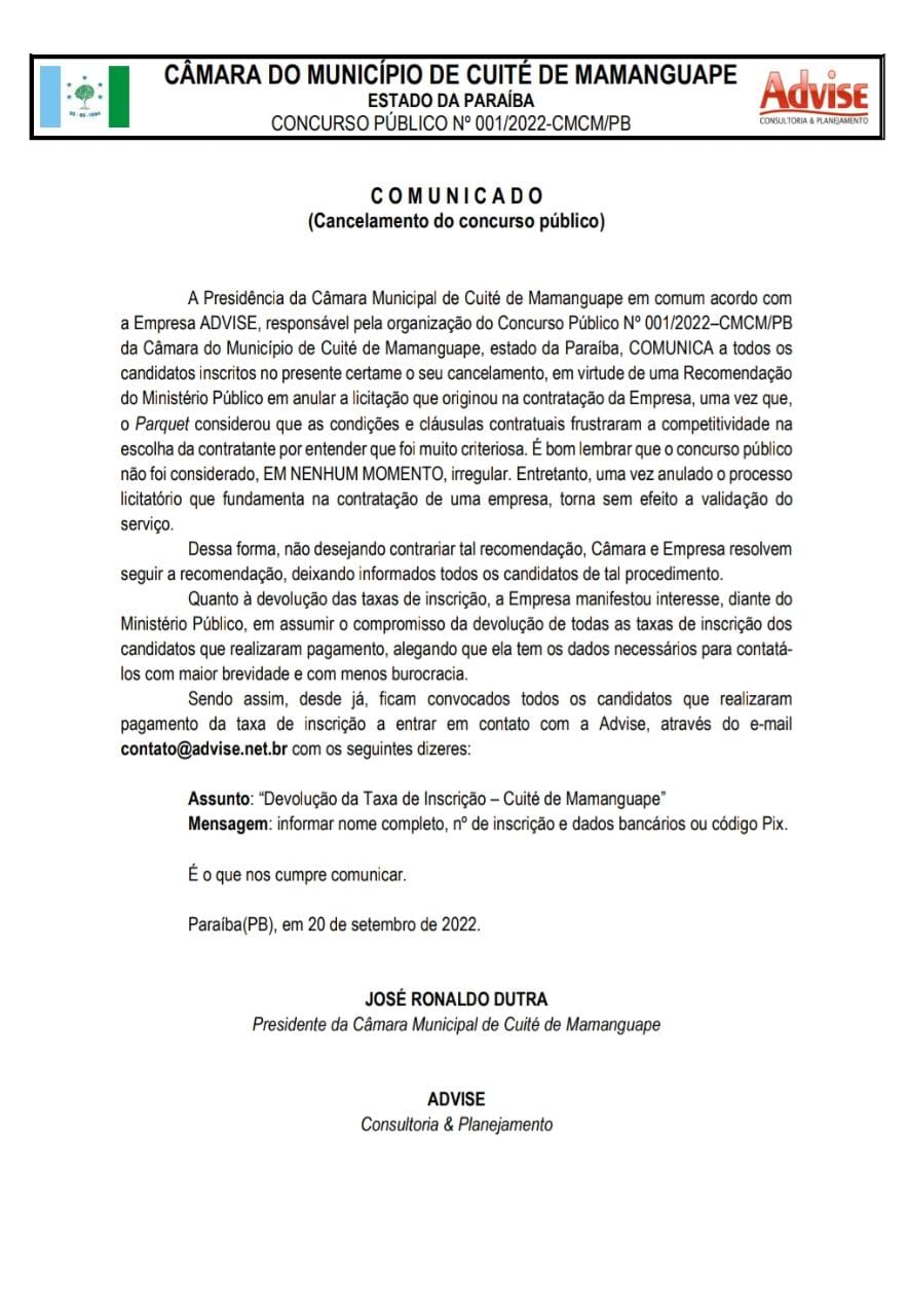 A realização das provas do concurso público da Câmara Municipal de Cuité de Mamanguape, litoral norte do estado, foi cancelada após o órgão acatar uma recomendação da Promotoria do Ministério Público da Paraíba (MPPB). A informação foi publicada no Diário Oficial do Estado (DOE) na edição de hoje (22) e consta como assinada pelo presidente da câmara, Ronaldo Dutra, no dia 20 de setembro. As provas ocorreriam no próximo domingo (25).