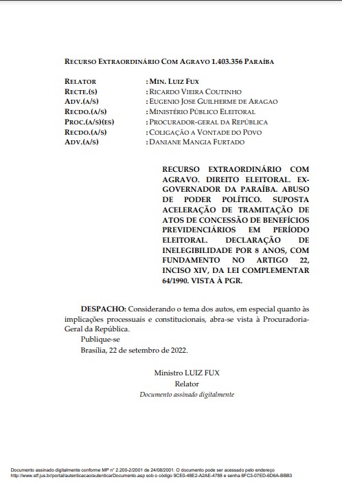 O ministro Luiz Fux, do Supremo Tribunal Federal (STF) abriu vistas do recurso do ex-governador Ricardo Coutinho para que a Procuradoria Geral da República se manifeste nos autos. O despacho foi publicado no fim da tarde desta quinta-feira (22), conforme apurou o ClickPB.