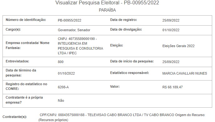 O Instituto Inteligência em Pesquisa e Consultoria (Ipec), antigo IBOPE, entrevista até o próximo dia primeiro de outubro, 800 pessoas. A pesquisa custou R$ 68.189,47 e foi contratada pela TV Cabo Branco. O resultado será divulgado no mesmo dia.
