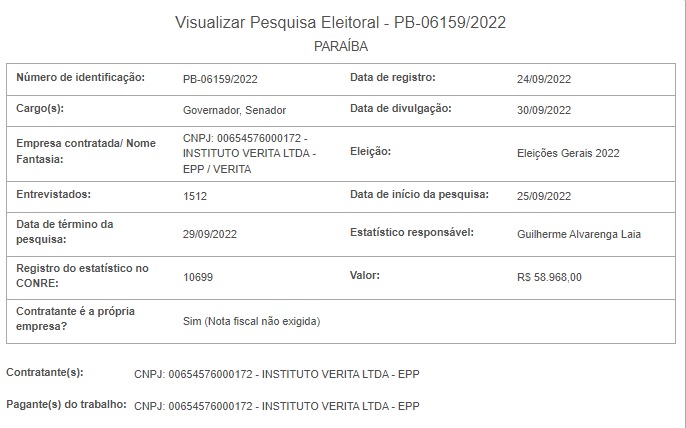 A Pesquisa Veritá foi contratada pelo próprio instituto e irá entrevistar 1.512 pessoas, até o dia 29/09/2022. O levantamento começou ontem (25). Segundo o Pesqele, o Veritá divulga o resultado da pesquisa na sexta-feira (30), último dia do mês de setembro. O valor do estudo é de R$ 58.968,00. O registro é de número 06159/2022 e foi realizado no dia 24/09.