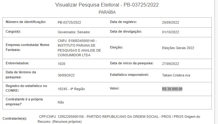 O Paraná Pesquisas foi contratado pelo Partido Republicano da Ordem Social (Pros) e irá realizar entrevistas entre 27/09 e 30/09, sob o custo de R$ 35.000,00. Serão entrevistados 1.020 cidadãos. Os dados serão divulgados também no dia primeiro.