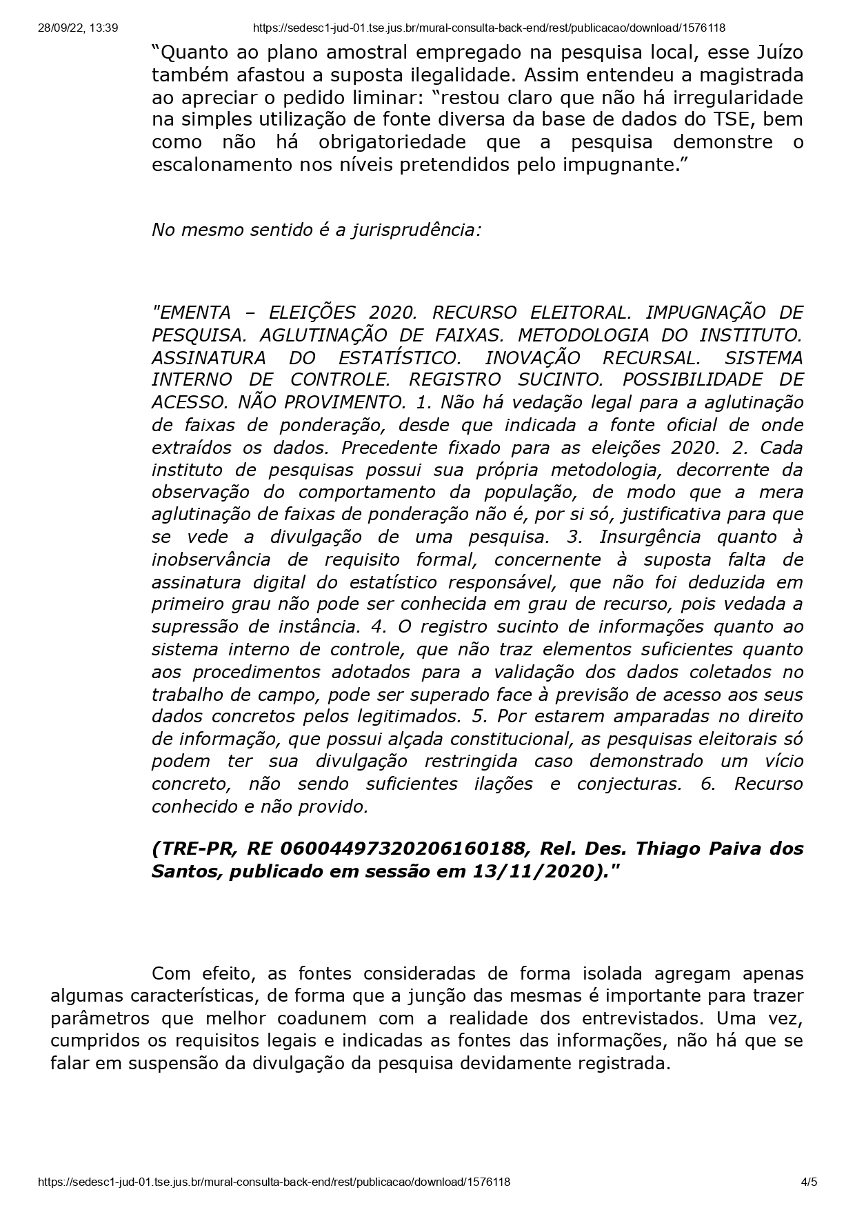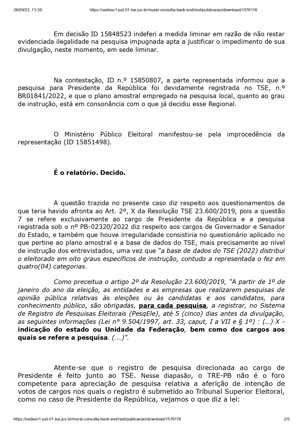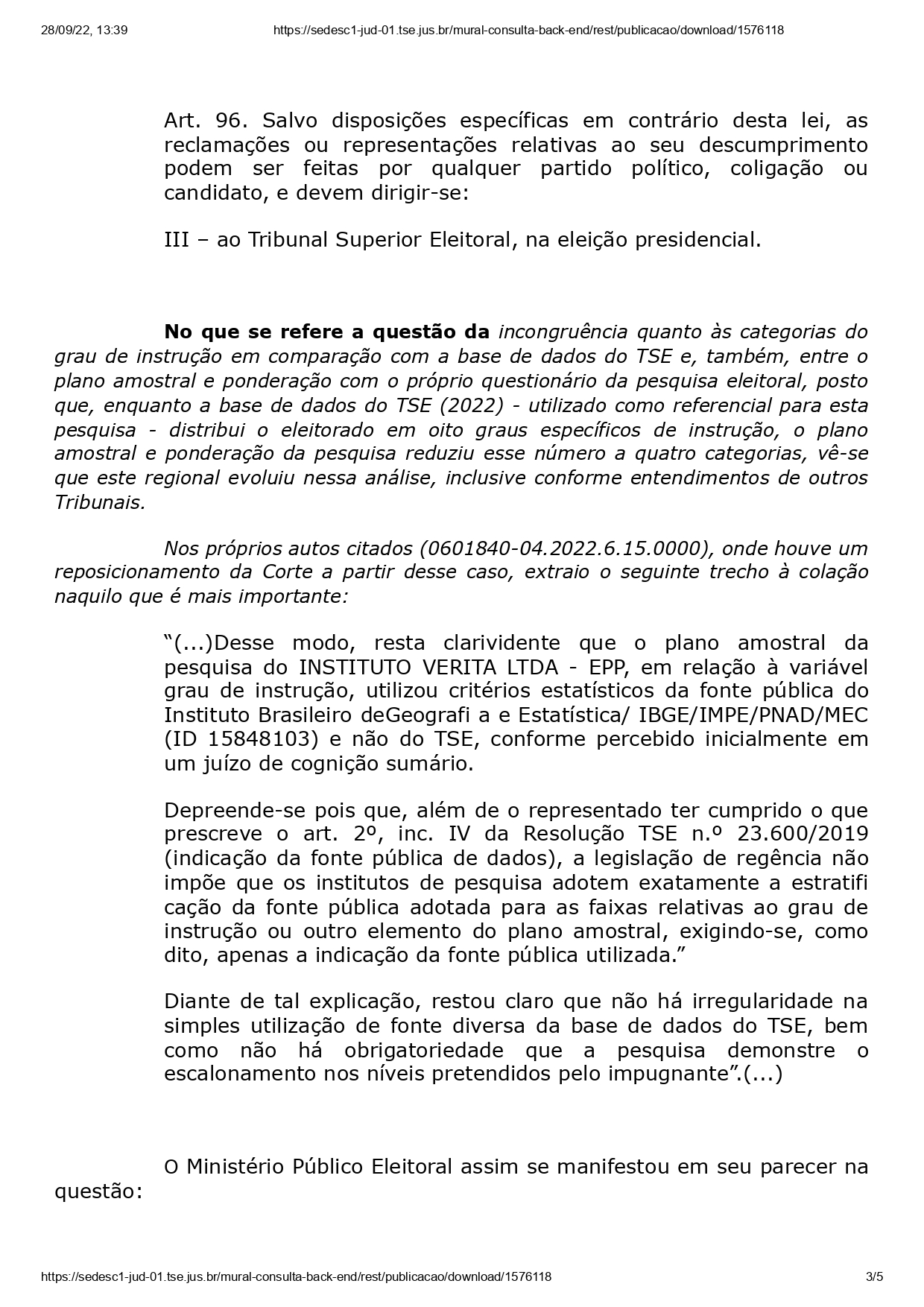 A juíza destacou que a Brasmarket se manifestou sobre o registro legal da pesquisa. “Na contestação, ID n.º 15850807, a parte representada informou que a pesquisa para Presidente da República foi devidamente registrada no TSE, n.º BR01841/2022, e que o plano amostral empregado na pesquisa local, quanto ao grau de instrução, está em consonância com o que já decidiu esse Regional.”