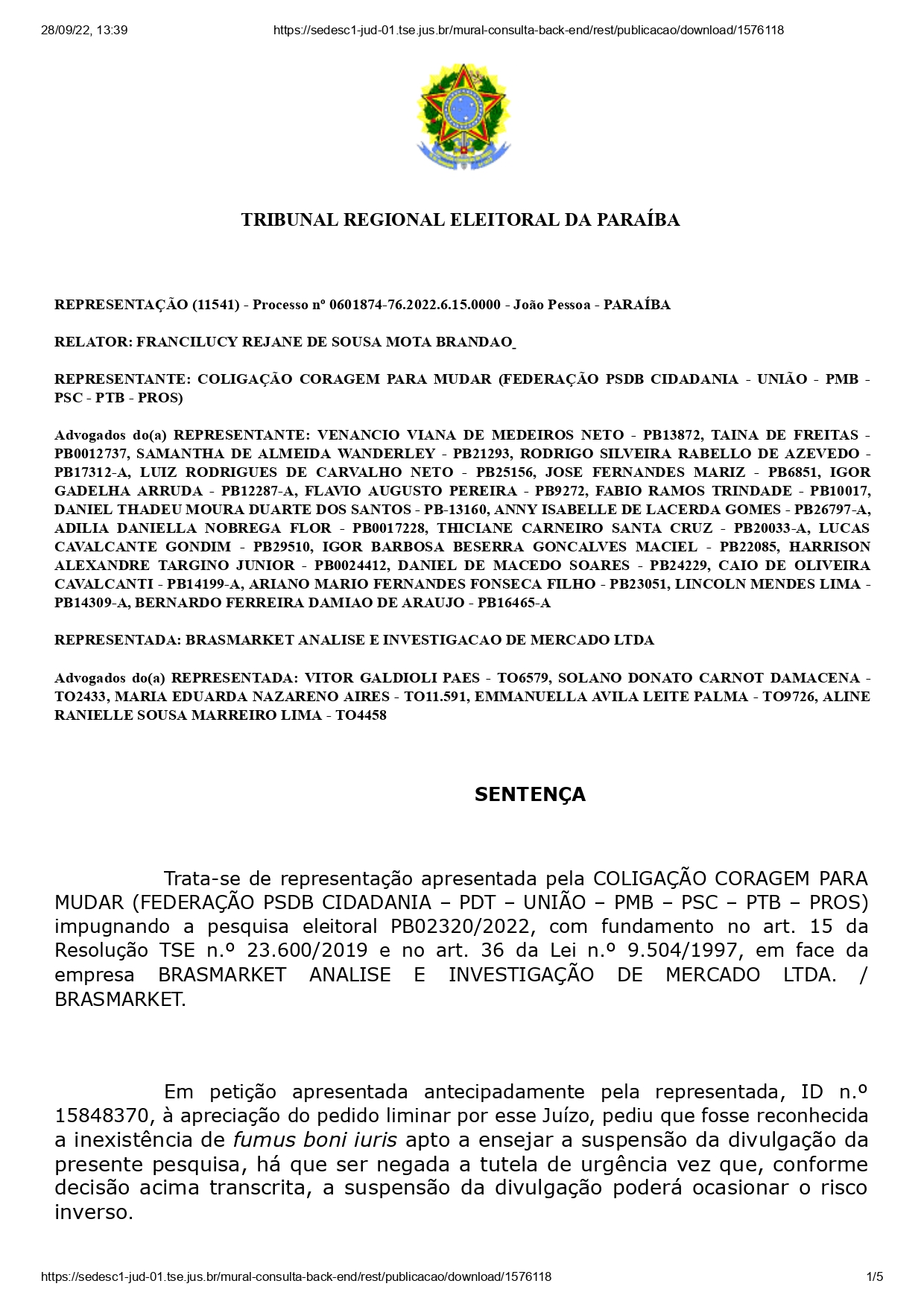 A juíza auxiliar da Propaganda Eleitoral doTribunal Regional Eleitoral da Paraíba (TRE-PB), Francilucy Rejane de Sousa Mota Brandão, rejeitou ação da Coligação Coragem Para Mudar, encabeçada por Pedro Cunha Lima (PSDB), que impugnou a pesquisa da Brasmarket Análise e Investigação de Mercado LTDA e pediu a suspensão de sua divulgação.