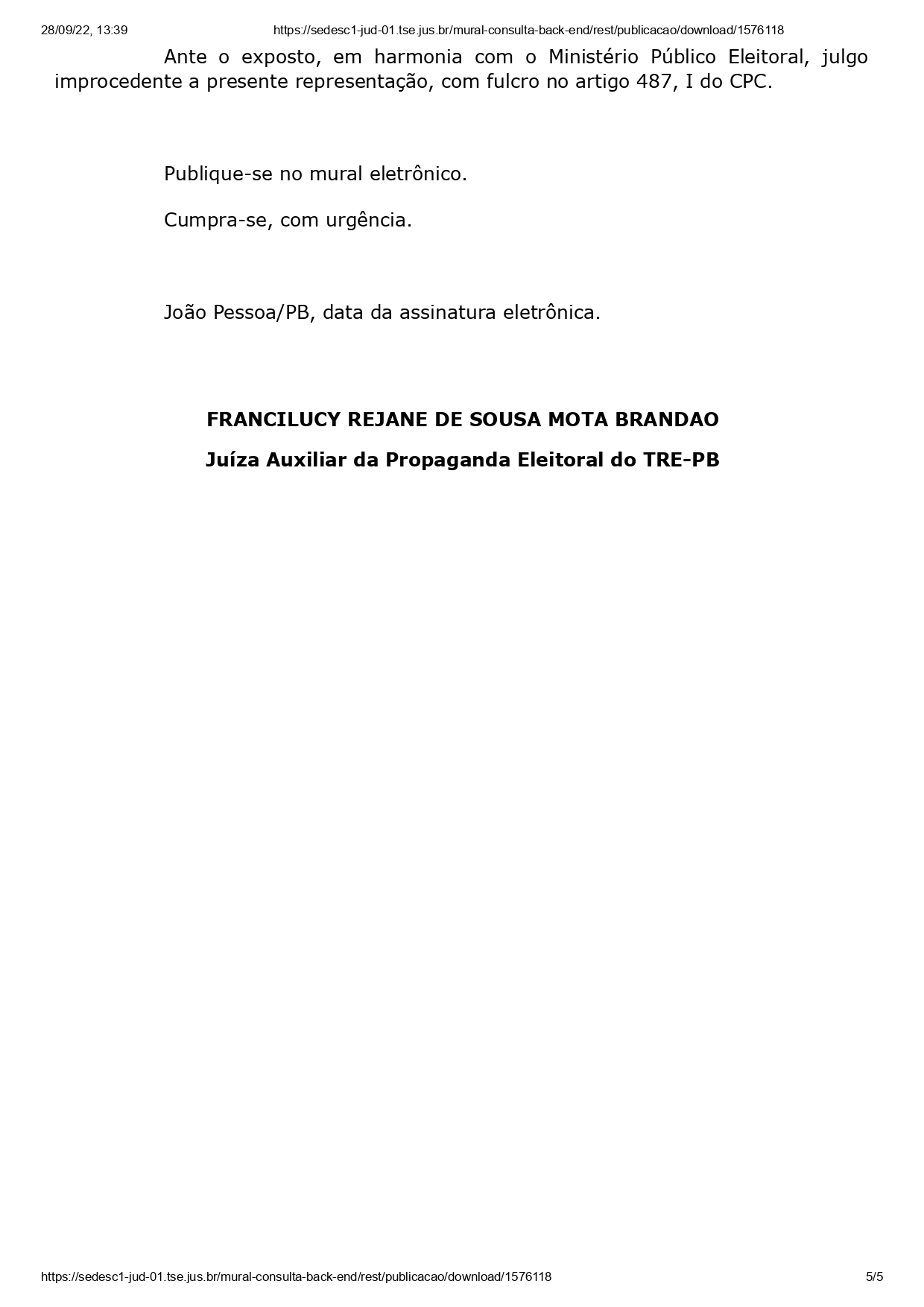 A juíza, então, decidiu pelo indeferimento da representação. “Com efeito, as fontes consideradas de forma isolada agregam apenas algumas características, de forma que a junção das mesmas é importante para trazer parâmetros que melhor coadunem com a realidade dos entrevistados. Uma vez, cumpridos os requisitos legais e indicadas as fontes das informações, não há que se falar em suspensão da divulgação da pesquisa devidamente registrada. Ante o exposto, em harmonia com o Ministério Público Eleitoral, julgo improcedente a presente representação, com fulcro no artigo 487, I do CPC.”
