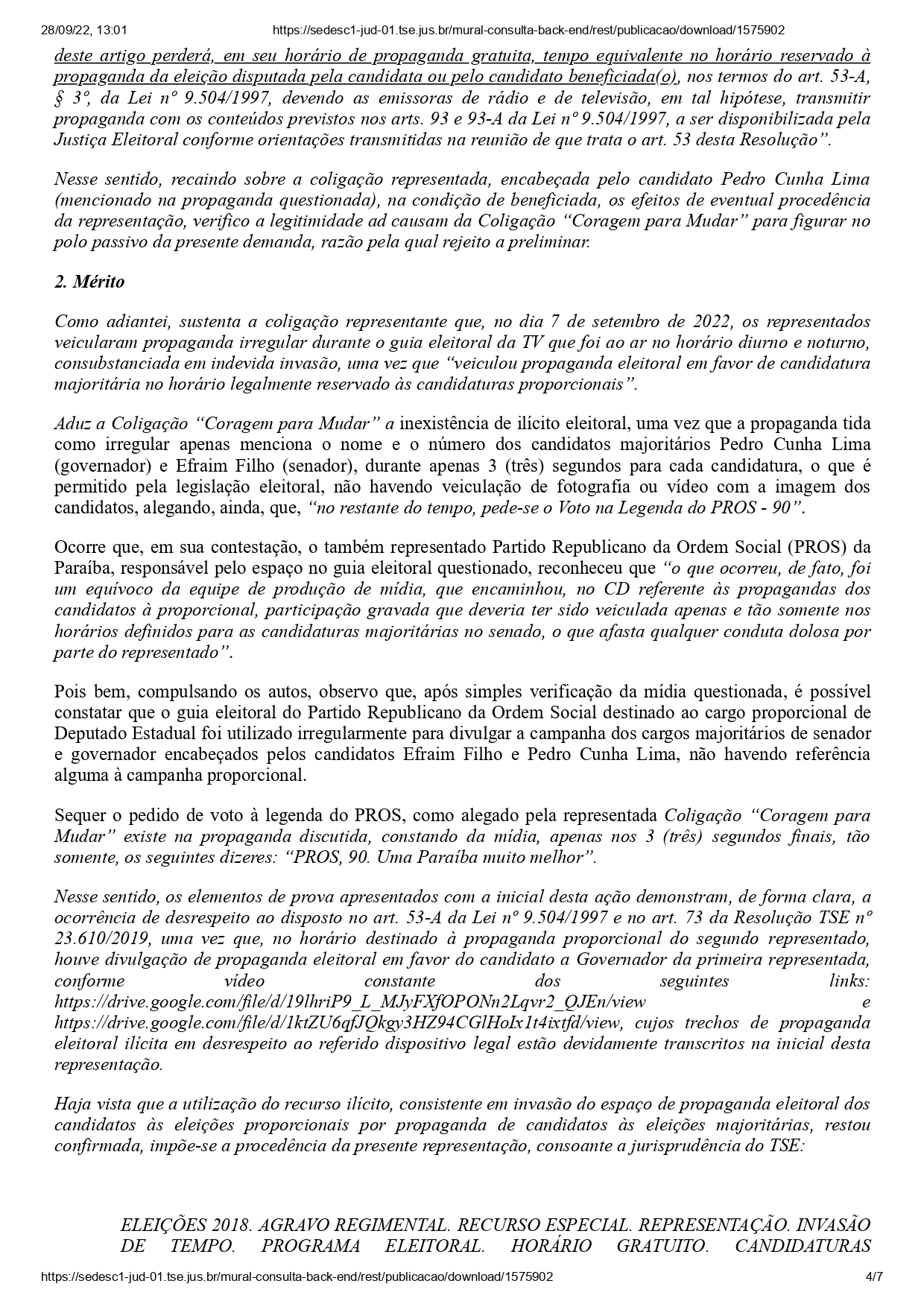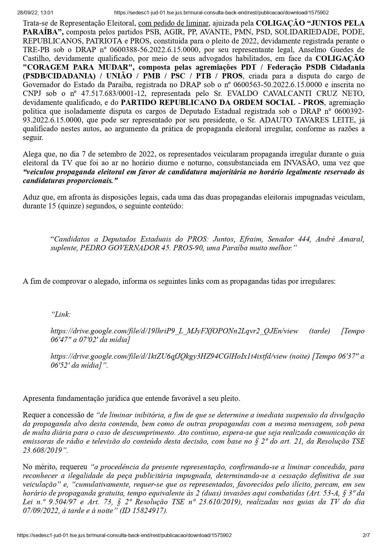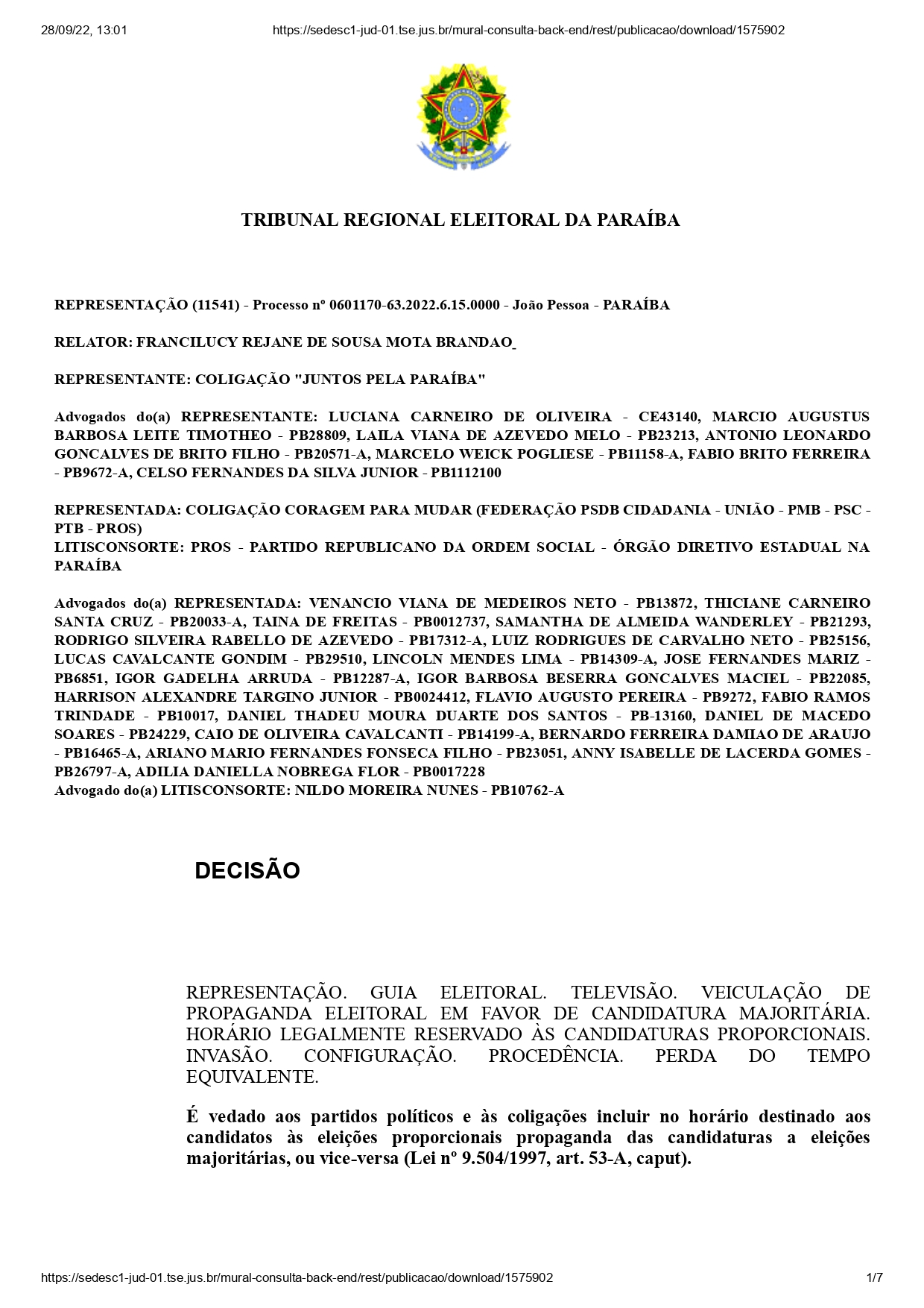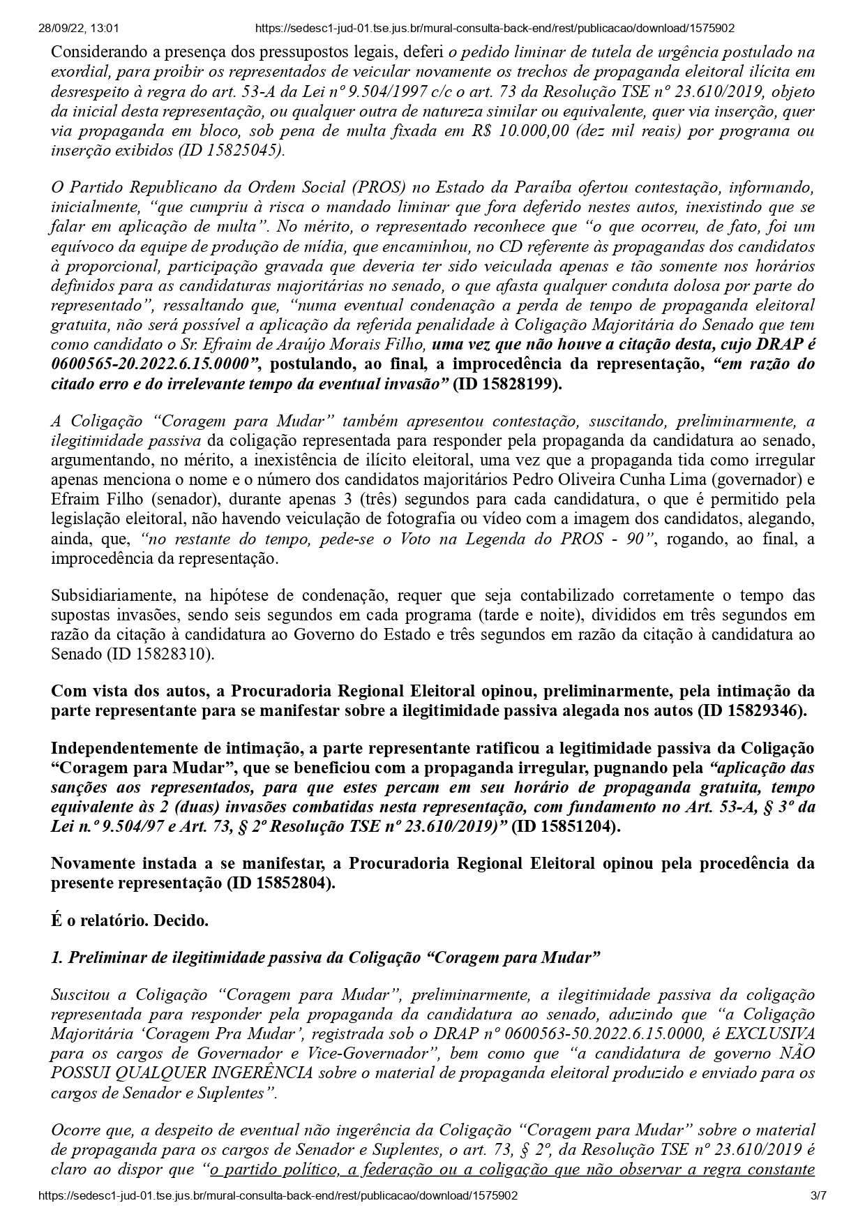 “Diante do exposto, em harmonia com o parecer do órgão ministerial, julgo parcialmente procedente a presente representação, para confirmar a liminar e determinar que o representado Partido Republicano da Ordem Social (PROS) da Paraíba se abstenha de veicular os trechos de propaganda eleitoral ilícita”, seguiu a decisão, “bem como para condenar a representada Coligação “Coragem para Mudar” (para os cargos de governador e vice-governador) à perda de 6 (seis) segundos, sendo 3 (três) segundos no guia eleitoral para TV destinado ao cargo de governador diurno e 3 (três) segundos no guia eleitoral para TV destinado ao cargo de governador noturno”, determinou a magistrada.