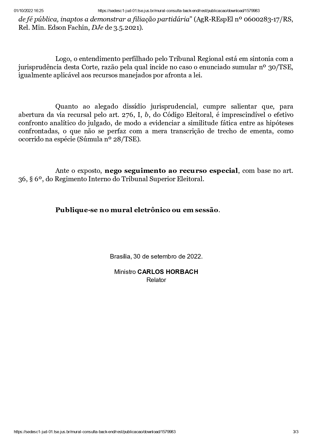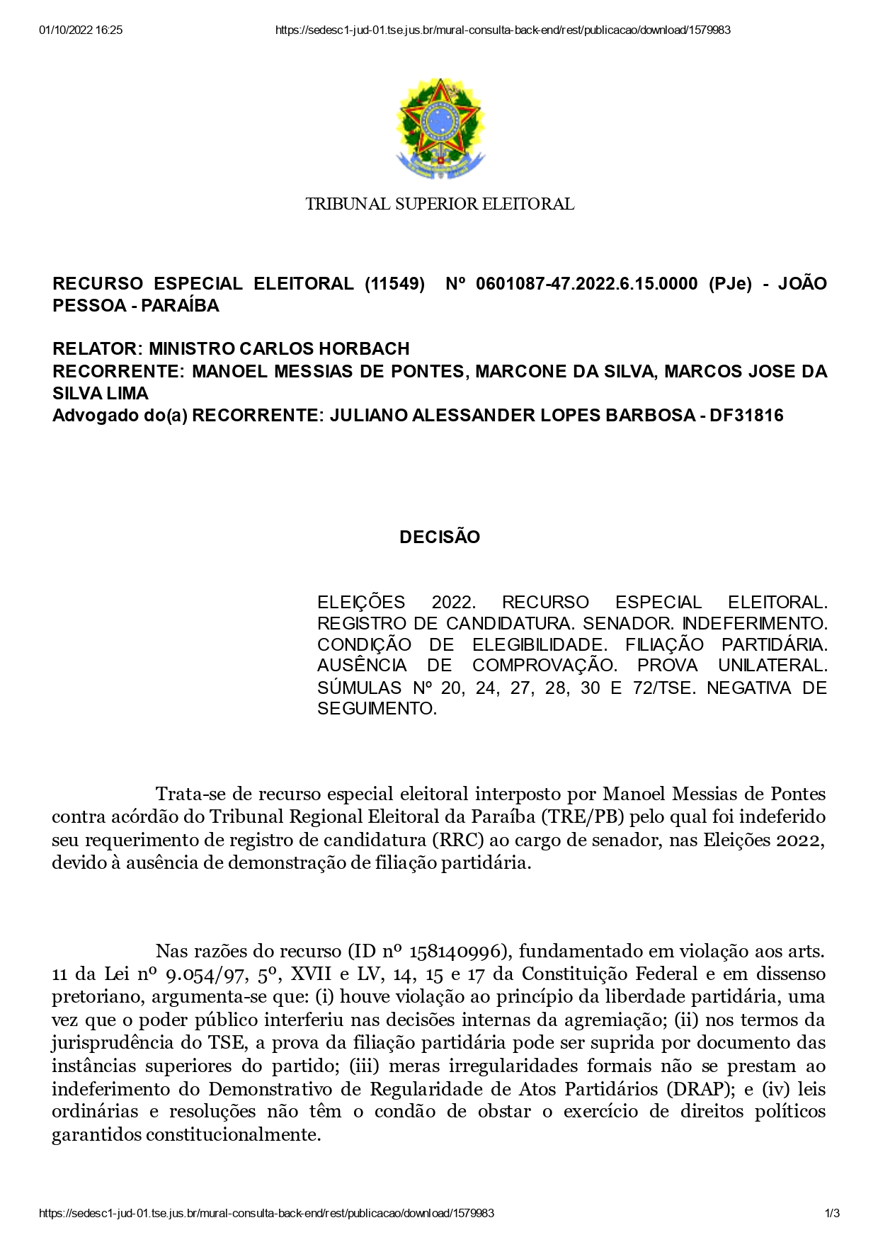 O ministro Carlos Horbach, do Tribunal Superior Eleitoral (TSE) negou seguimento ao recurso especial de Manoel Messias (PCO) e manteve o indeferimento de sua candidatura ao Senado da Paraíba. Em decisão publicada no mural eletrônico do TSE neste sábado (1º), o ministro destacou que “o entendimento perfilhado pelo Tribunal Regional está em sintonia com a jurisprudência desta Corte”.