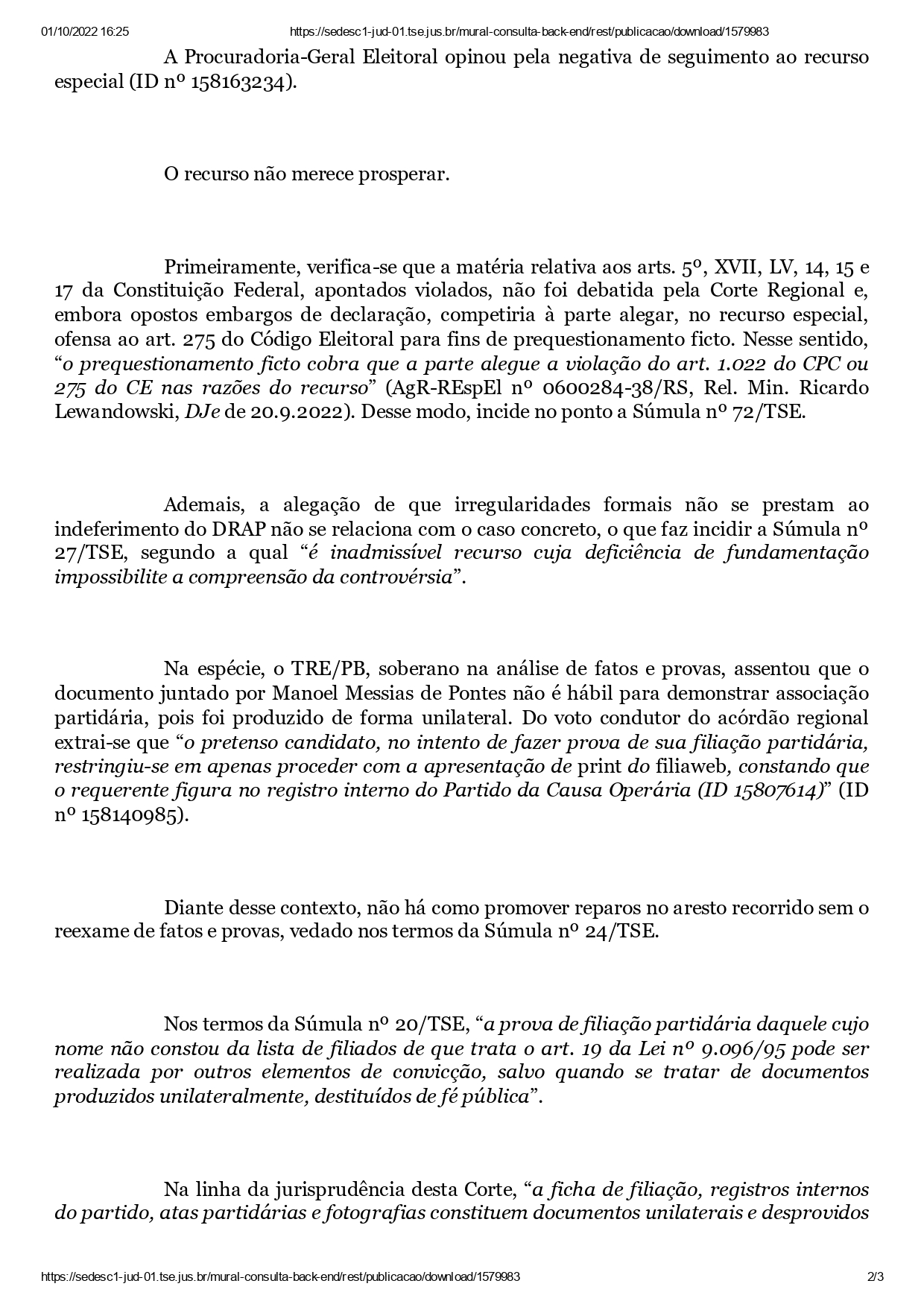 De acordo com o entendimento da Corte Eleitoral, a candidatura de Manoel Messias foi indeferida porque ele não comprovou filiação partidária. Segundo consta no processo, o documento apresentado por Manoel Messias para comprovar a filiação partidária teria sido produzido de forma unilateral, uma vez que foi feito apenas um print do filiaweb constando que ele está no registro interno do Partido da Causa Operária (PCO).