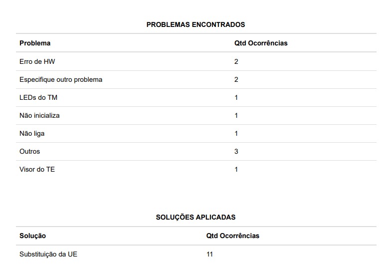 Os principais problemas que levaram à substituição de urnas foi erro de hardware e outros, além de problemas nos LEDs dos terminais, não ligaram ou não inicializaram.