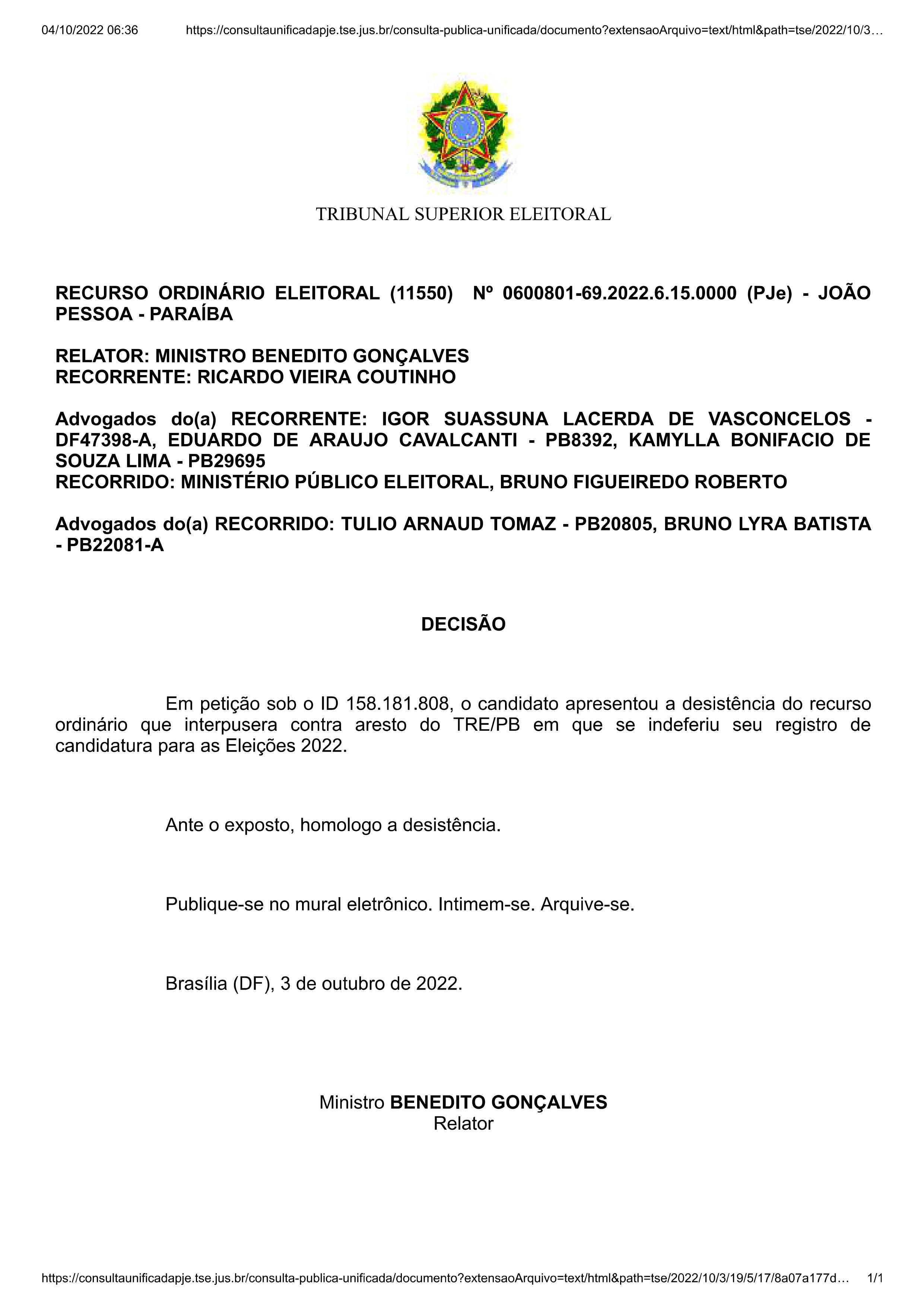 Conforme apurou o ClickPB, nesta terça-feira (4), o recurso do ex-governador teve a desistência homologada pelo ministro Benedito Gonçalves, relator do processo.