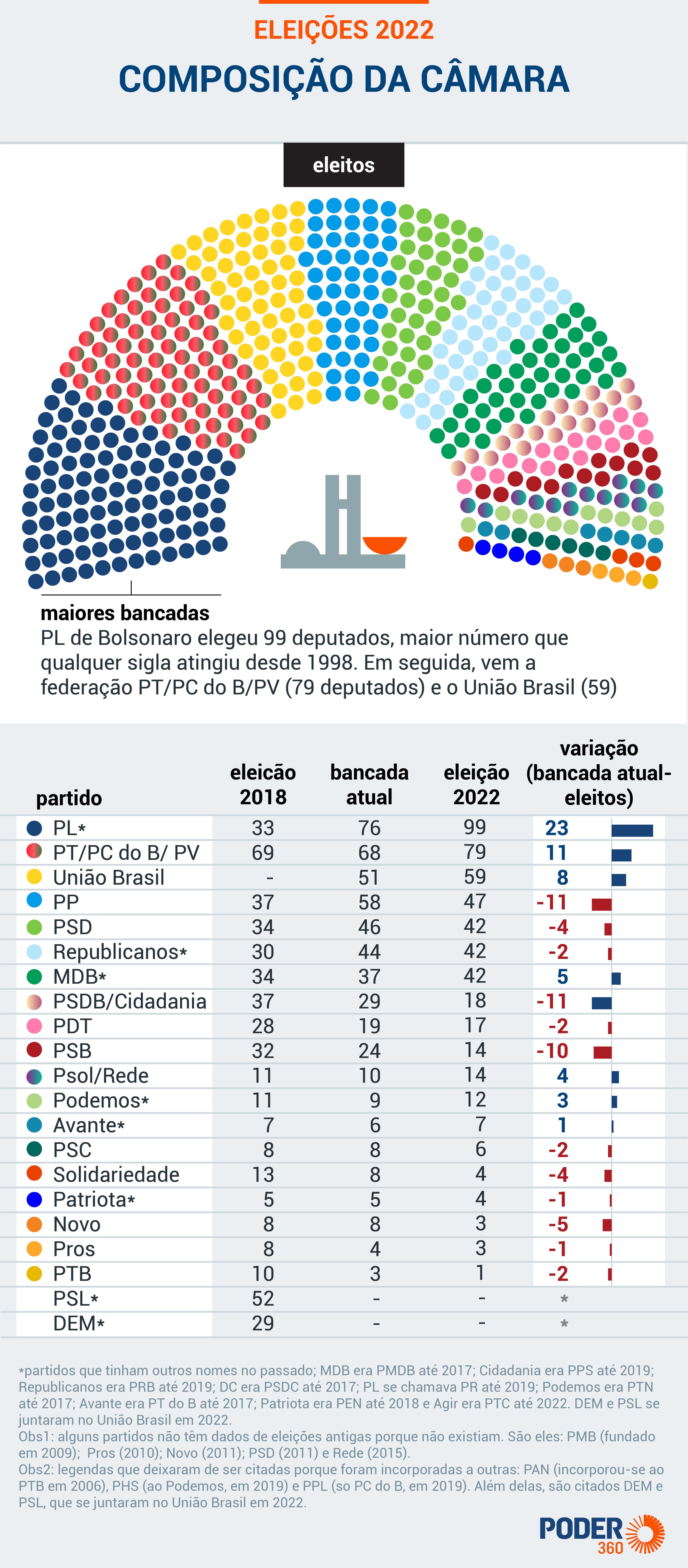 Ao todo, o PL conquistou 99 cadeiras e consolidou a liderança na Câmara. Triplicou o número de deputados em relação ao pleito de 2018, quando elegeu 33 representantes ainda como PR (Partido da República).