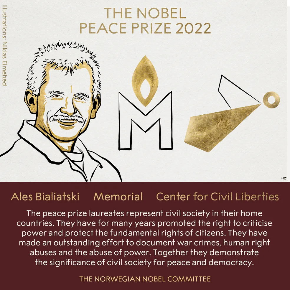“O comitê do Prêmio Nobel quis honrar três campeões dos Direitos Humanos, da democracia e da co-existência pacífica nos países vizinhos Belarus, Rússia e Ucrânia. Eles honram a visão de Alfred Nobel sobre paz e convivência, uma visão tão necessária no mundo hoje”, declarou o comitê.