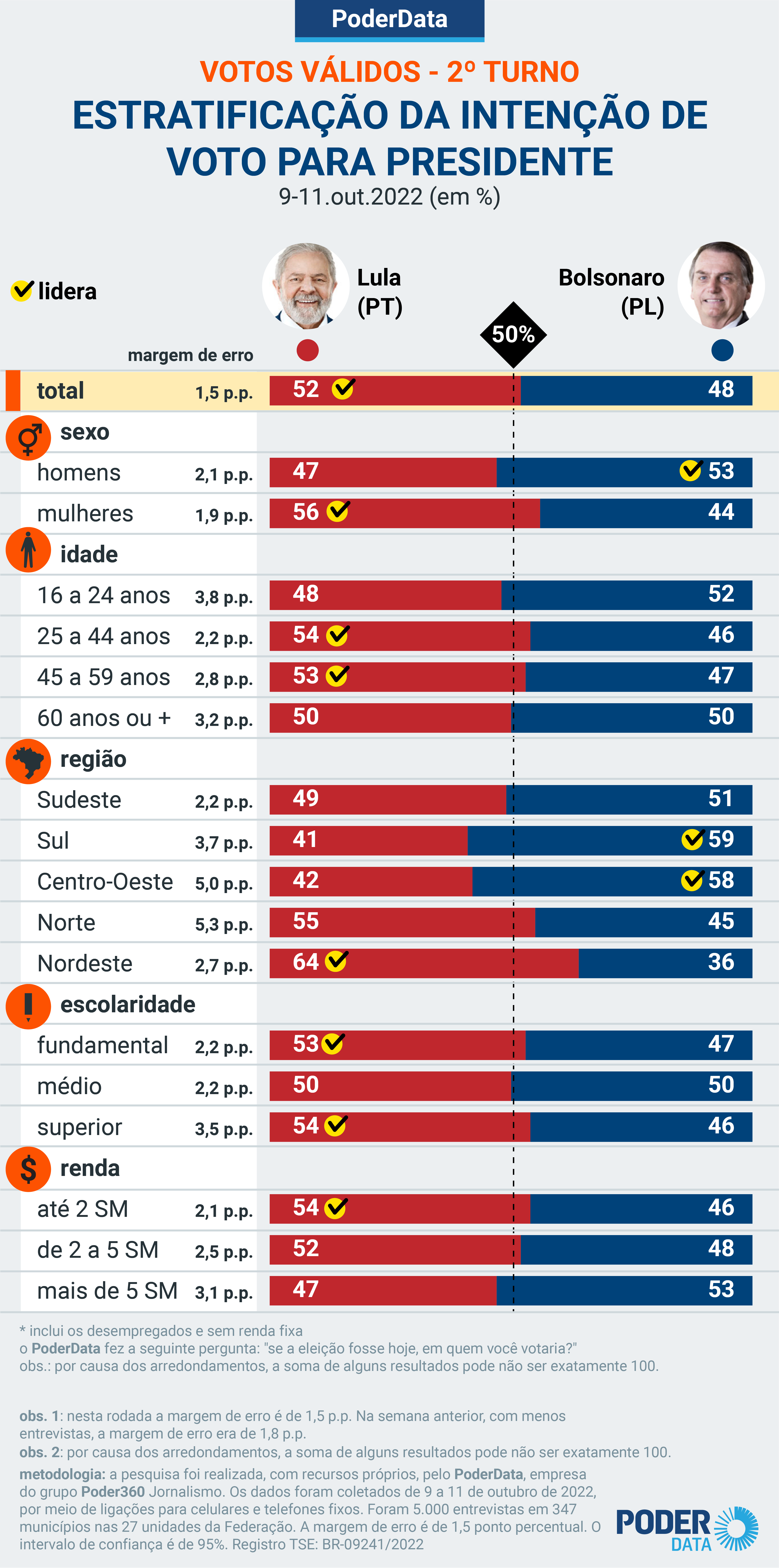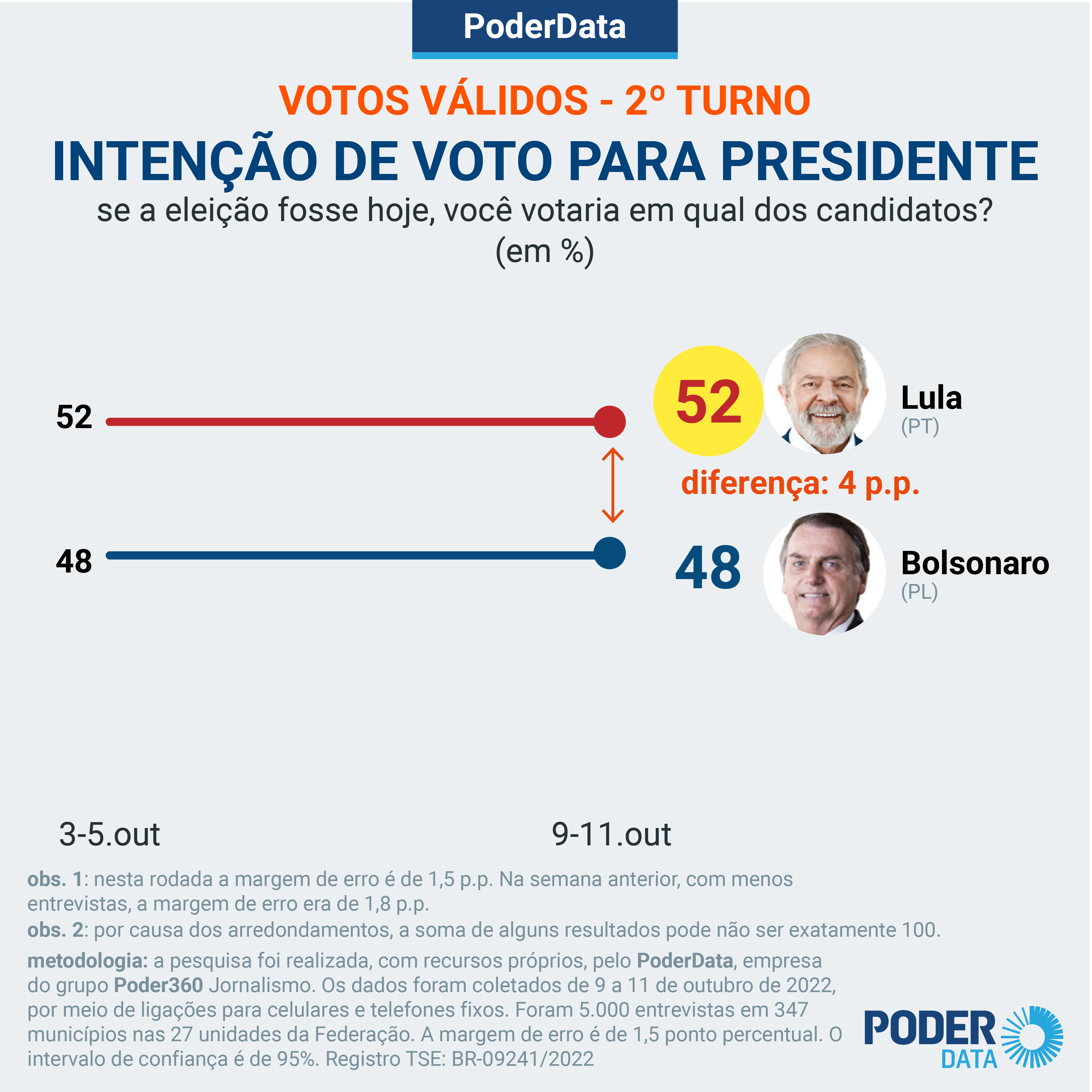 Pesquisa PoderData realizada de 9 a 11 de outubro de 2022 mostra Luiz Inácio Lula da Silva (PT) com 52% das intenções de votos válidos contra 48% de Jair Bolsonaro (PL) na corrida de 2º turno pela Presidência da República. As taxas consideram os votos válidos –os dados a algum candidato, excluindo-se brancos e nulos. É assim que o TSE (Tribunal Superior Eleitoral) divulgará os resultados na noite do domingo eleitoral de 2º turno, em 30 de outubro.