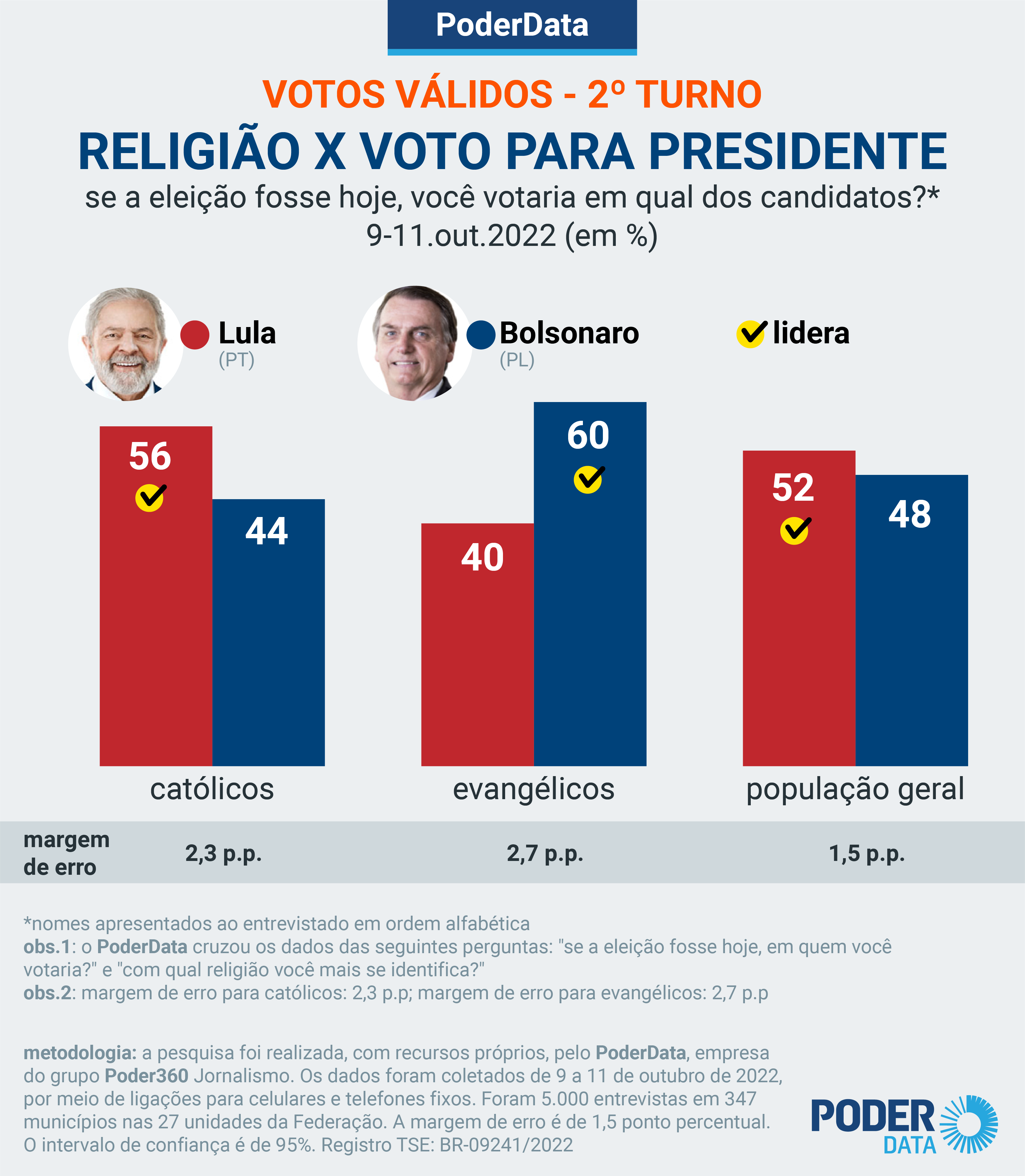 Bolsonaro vence Lula entre evangélicos (60% X 40% dos votos válidos), enquanto o petista ganha entre católicos (56% X 44%).