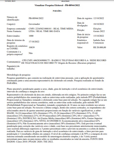A Real Time Big Data registrou uma nova pesquisa para governador do estado da Paraíba. com divulgação marcada para a próxima semana. A pesquisa começará a coleta de dados no próximo sábado (15) e a previsão é que os resultados sejam publicizados na próxima terça-feira, dia 18. A pesquisa, que foi contratada pela Rede Record abrangerá todo o estado.