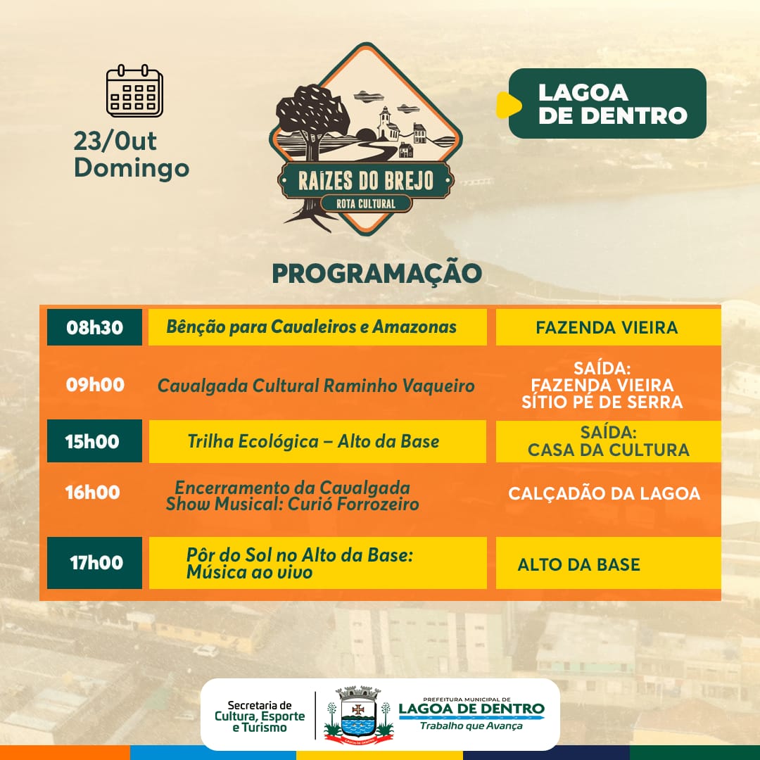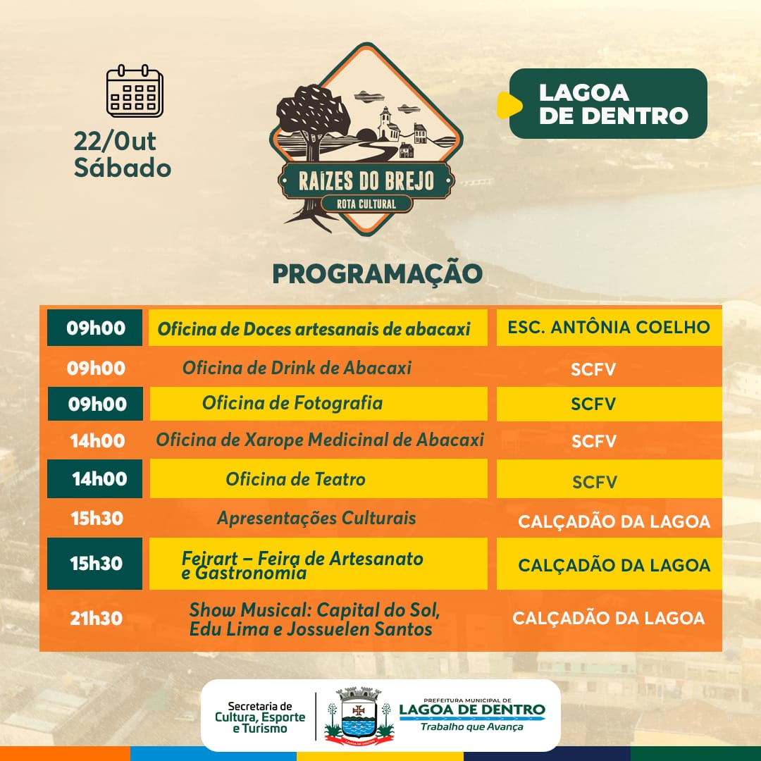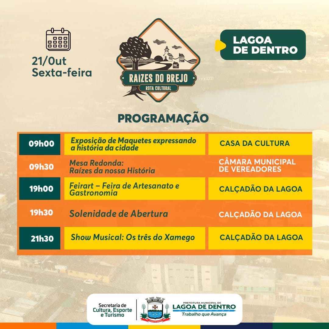 De 21 a 23 de outubro acontece em Lagoa de Dentro, no agreste paraibano, a rota Cultura Raízes do Brejo com uma vasta programação artistíca e cultural que promente movimente a cidade.
