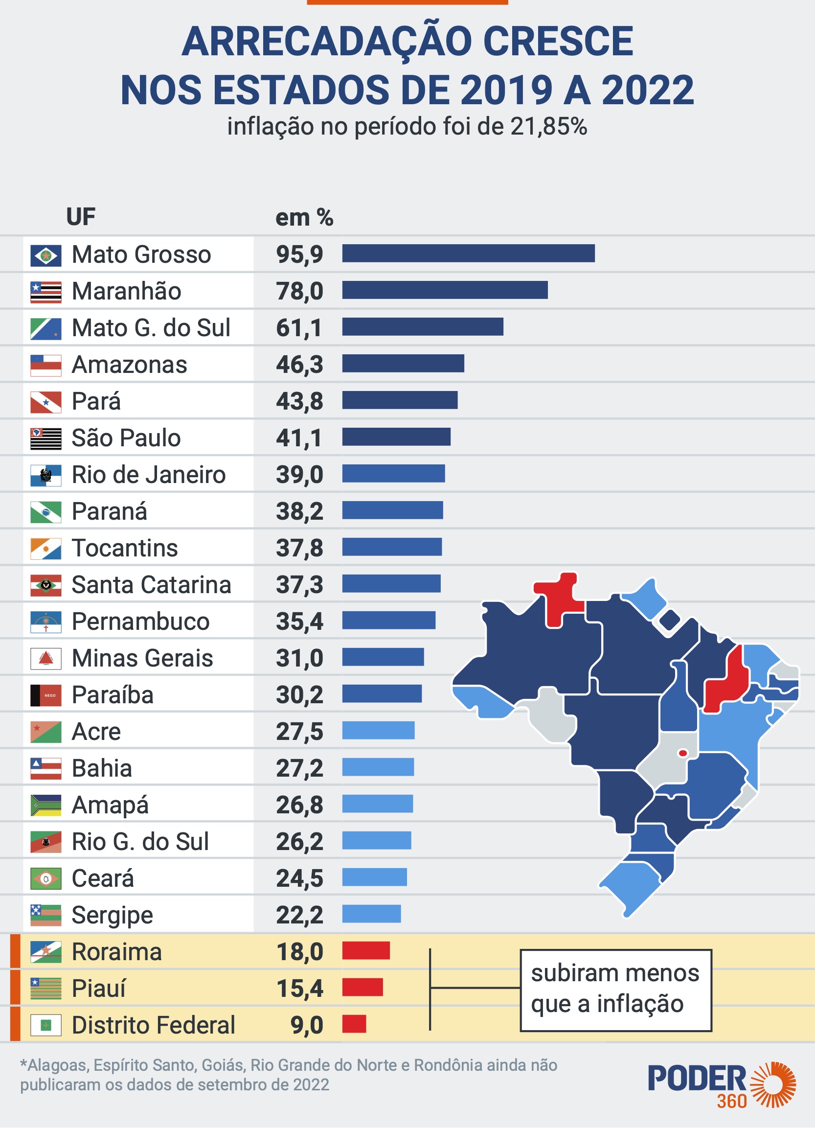 Estão fora da conta Alagoas, Espírito Santo, Goiás, Rio Grande do Norte e Rondônia. Esses Estados ainda não apresentaram os dados de setembro.