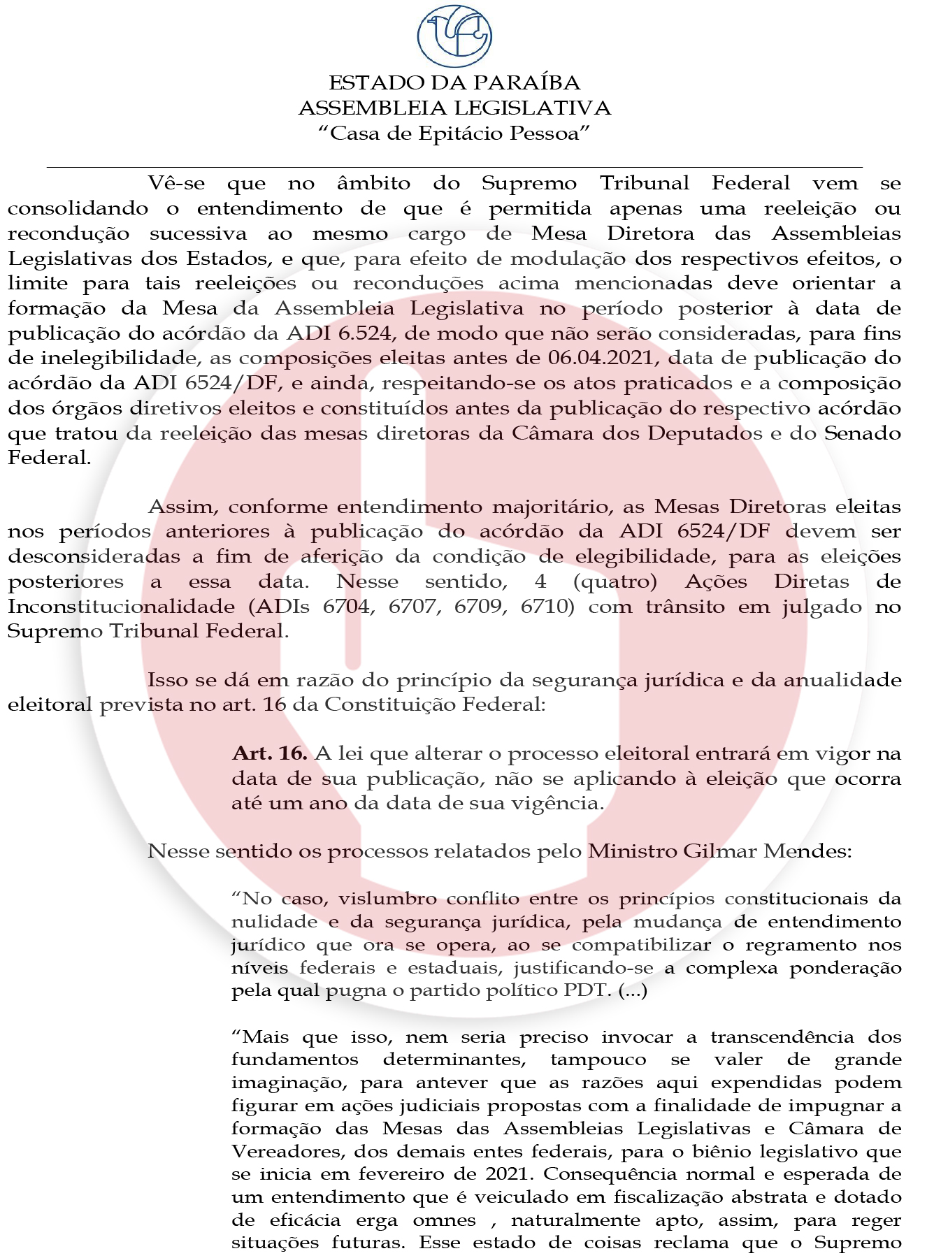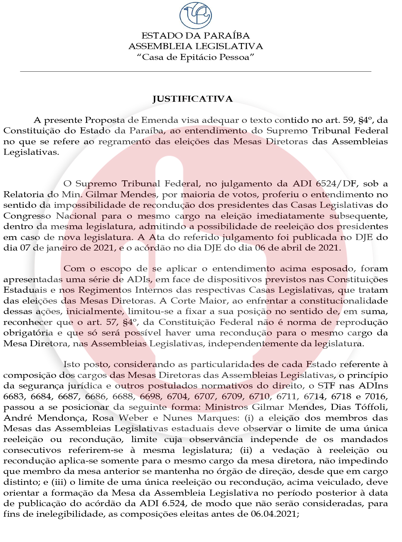 Na justificativa da proposta, obtida pelo ClickPB, explica-se que a intenção é adequar o texto constitucional à decisão do Supremo Tribunal Federal (STF). Em julgamento de ADI, os ministros entenderam pela impossibilidade de recondução dos presidentes das Casas Legislativas do Congresso Nacional para o mesmo cargo na eleição imediatamente subsequente, dentro da mesma legislatura. Também foi admitida a possibilidade de reeleição dos presidentes em caso de nova legislatura, segundo o documento.