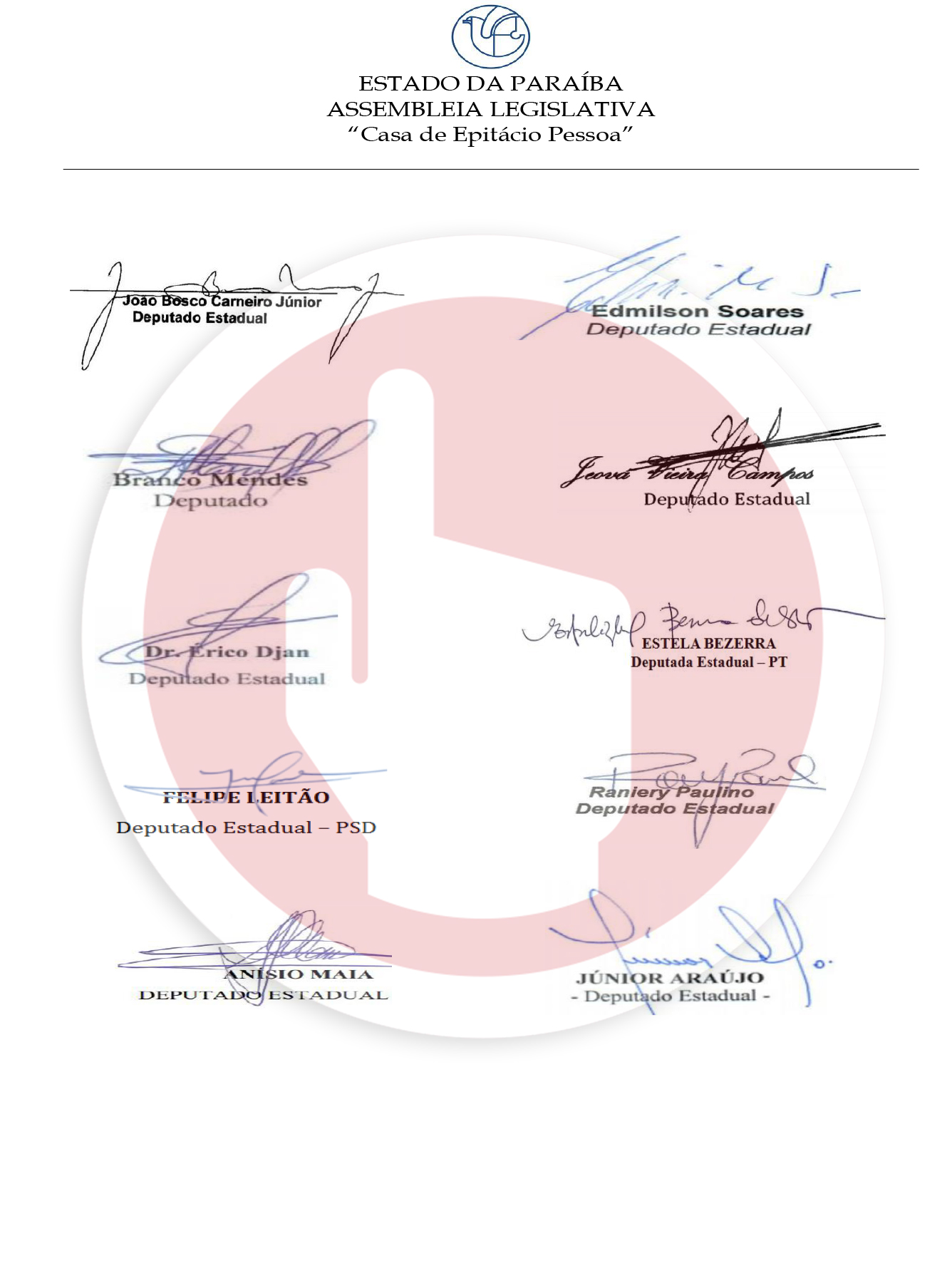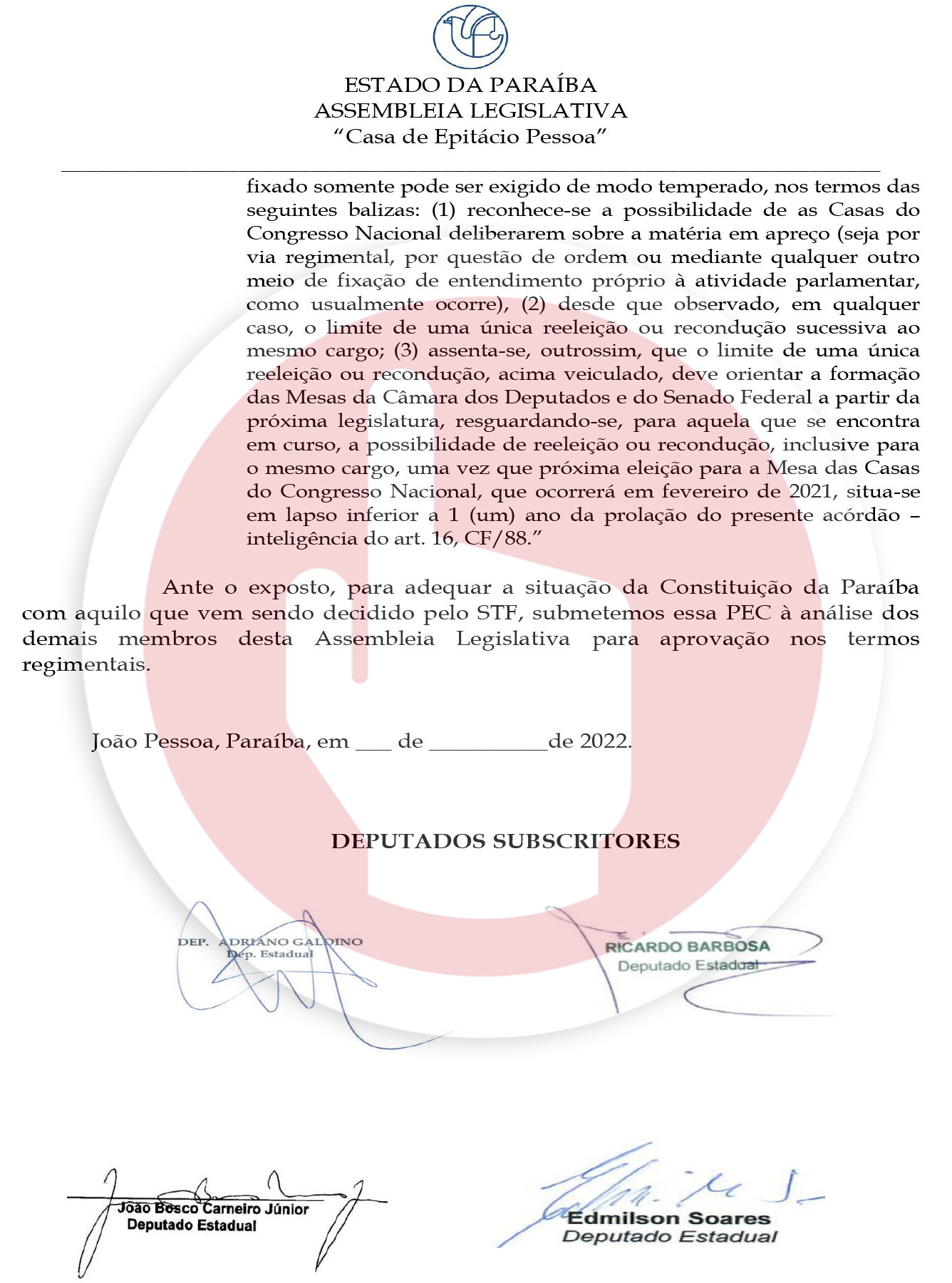 Subscrevem a Proposta de Emenda Constitucional os deputados Adriano Galdino, Ricardo Barbosa, João Bosco Carneiro, Edmilson Soares, Branco Mendes, Jeová Campos, Dr. Érico, Estela Bezerra, Felipe Leitão, Raniery Paulino, Anísio Maia e Júnior Araújo.