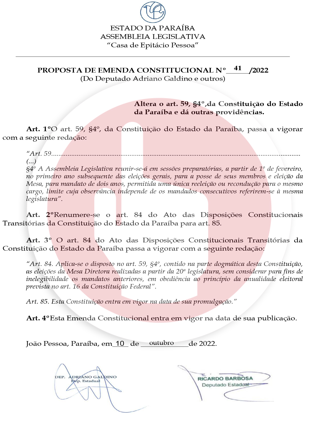 O presidente da Assembleia Legislativa da Paraíba (ALPB), Adriano Galdino (PSB), apresentou uma emenda à Constituição para regulamentar a reeleição para o cargo máximo da mesa diretora da Casa de Epitácio Pessoa. De acordo com o novo texto, que deverá ser aplicado a partir da próxima legislatura, um deputado só poderá ser presidente da Assembleia por duas vezes consecutivas.