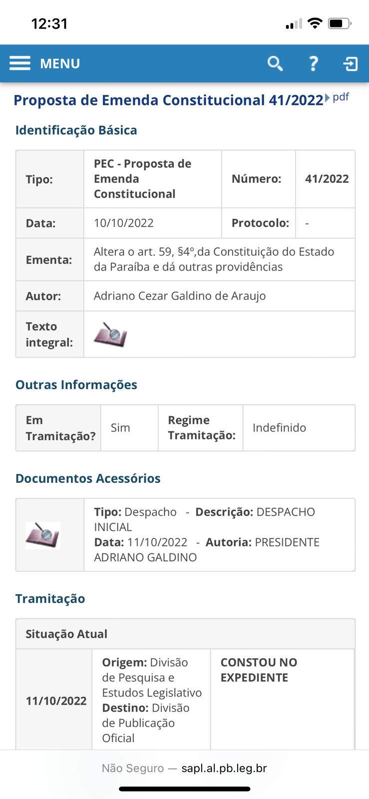 A Proposta de Emenda Constitucional (PEC) foi protocolada no dia 10 de outubro e segue em tramitação na casa. Segundo o texto, os presidentes da Assembleia Legislativa da Paraíba poderão ser eleitos e reeleitos somente uma vez. Somente após um novo mandato, com alternância da Mesa Diretora, é que a pessoa poderá ser eleita mais uma vez.