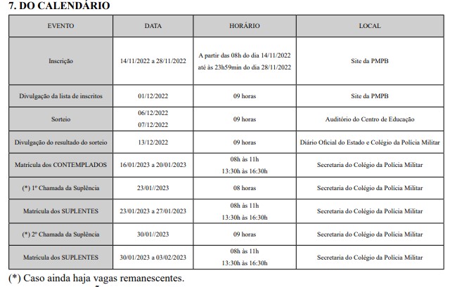 Foi publicado no Diário Oficial do Estado (DOE), nesta quinta-feira (20), o edital de processo seletivo com 156 vagas para o Colégio da Polícia Militar Estudante Rebeca Cristina Alves Simões, localizado no bairro de Mangabeira, em João Pessoa. As inscrições para o ano letivo 2023 serão abertas no dia 14 de novembro e encerradas no dia 28 do mesmo mês e devem ser feitas no site da Polícia Militar da Paraíba.