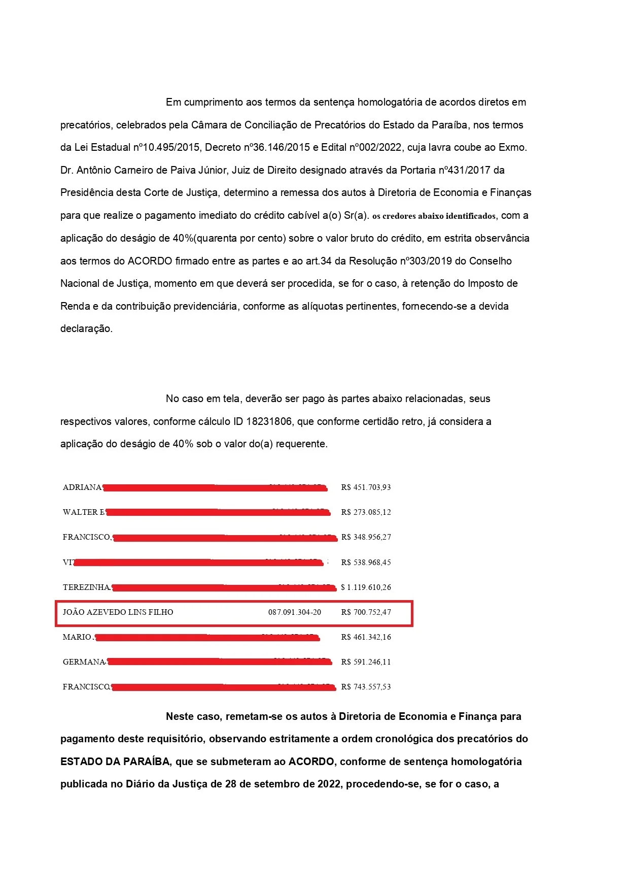 Além de João Azevêdo, outros servidores também fizeram o mesmo pedido. Aí vem uma outra parte cabeluda da história. O governador ignorou até mesmo as dificuldades de investimentos para a Paraíba e resolveu tudo com um acordo com o próprio governo. Para antecipar o recebimento, abriu mão de 40% da dívida e vai receber a parte dele ainda esse ano. Detalhe é que hoje, o Governo da Paraíba está pagando os inscritos de 2007.