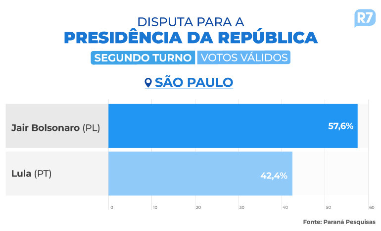 O presidente da República e candidato à reeleição, Jair Bolsonaro (PL), aparece com 57,6% dos votos válidos (que não consindera brancos e nulos) no estado de São Paulo, segundo o levantamento do Paraná Pesquisas divulgado nesta sexta-feira (21). O ex-presidente Luiz Inácio Lula da Silva (PT) tem 42,4%.