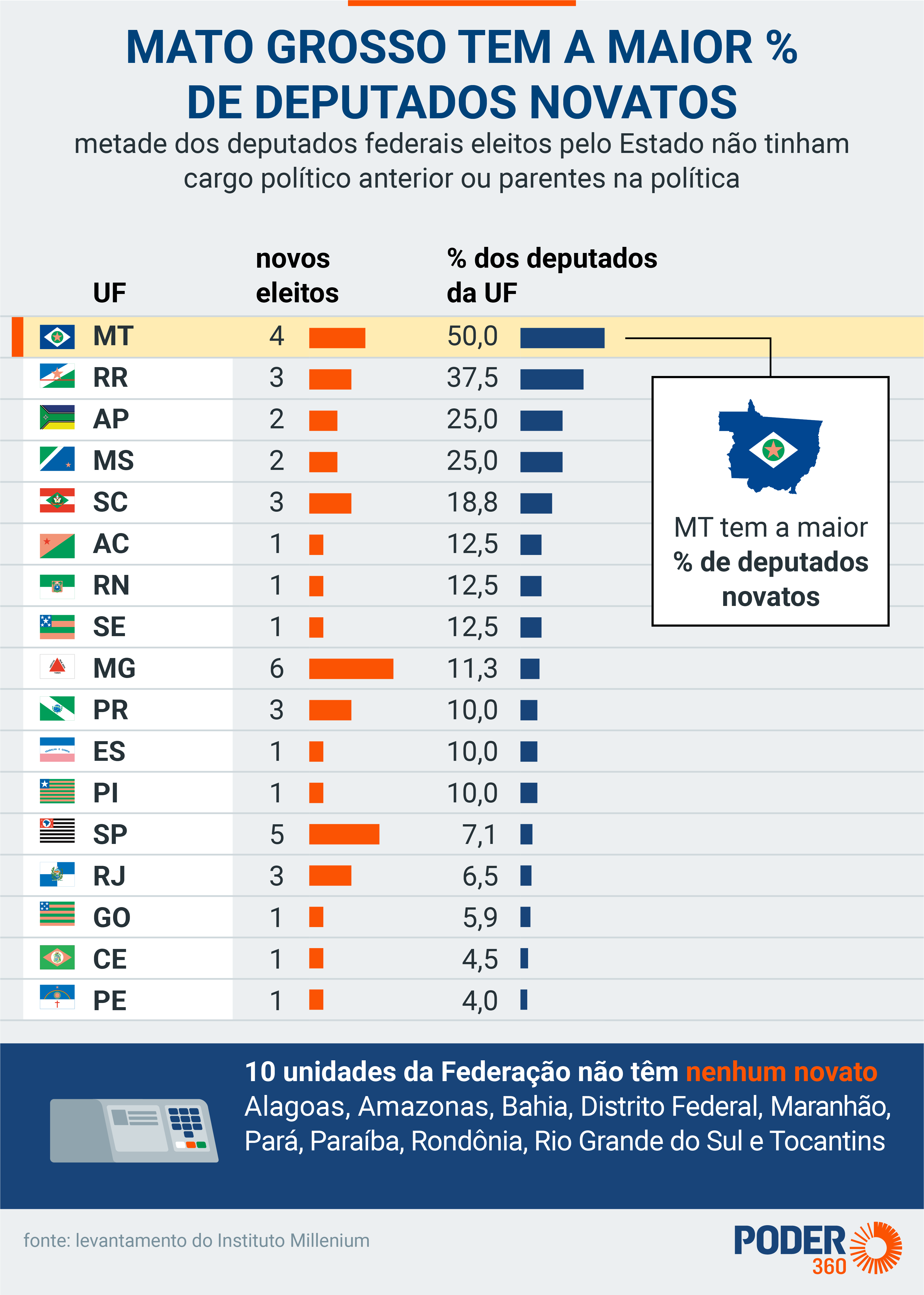 No recorte por Estados, Mato Grosso teve metade dos 8 deputados eleitos sem vínculo pregresso com a política tradicional. Em número absoluto, Minas Gerais elegeu mais novatos (6).