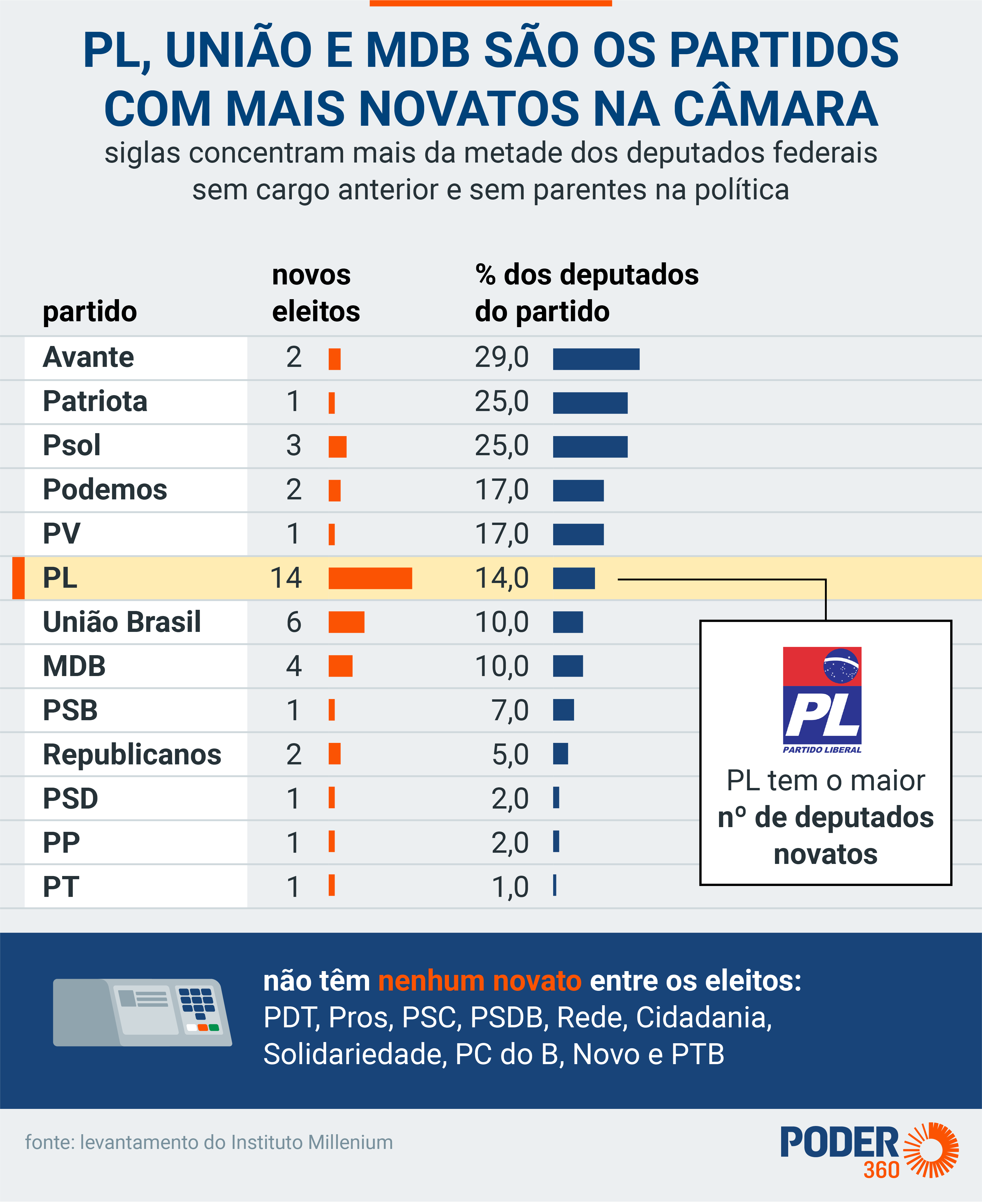 A maioria dos novatos está em partidos conservadores e do chamado “centrão”, como PL (14), União Brasil (6) e MDB (4). Há 10 legendas sem nenhuma novidade entre os eleitos.