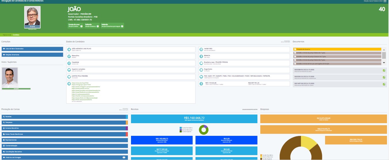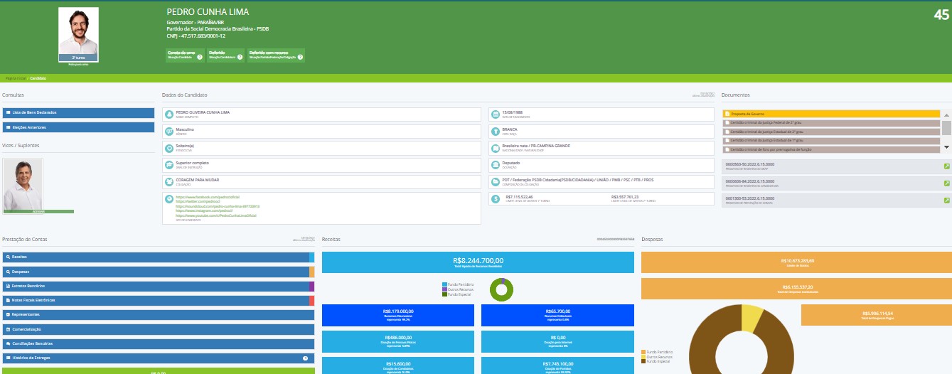 O candidato Pedro Cunha Lima arrecadou R$ 8.244.700,00 para usar na campanha, desse total, ele já utilizou ou comprometeu R$6.155.537,20. Já o candidato a reeleição João Azevedo recebeu R$ 5.160.666,72, e já ultrapassou esse número tendo o total de despesas contratadas chegando a R$ 8.019.646,73.