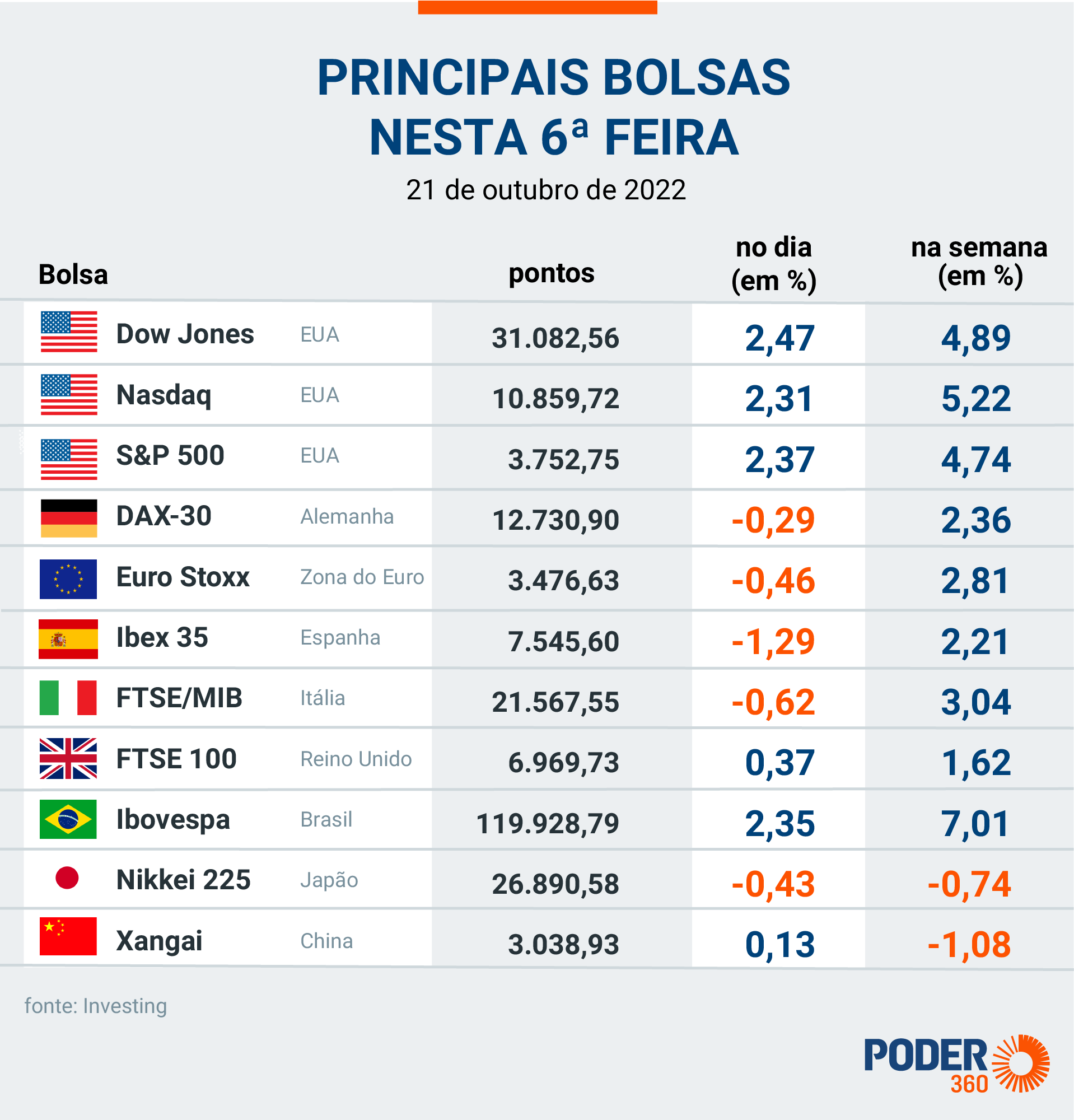 A alta das ações foi acompanhada pelo otimismo no mercado internacional. Os principais índices dos Estados Unidos subiram nesta 6ª feira (21.out.2022). Além disso, o Ibovespa, principal índice da B3 (Bolsa de Valores de São Paulo), avançou 7,01% na semana, a maior alta semanal desde novembro de 2020.