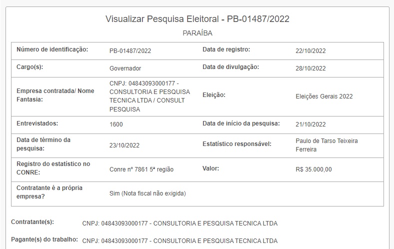A margem de erro é de 2,45% para mais ou para menos. O nível de confiança é de 95%. A pesquisa está registrada sob o código PB-01487/2022.