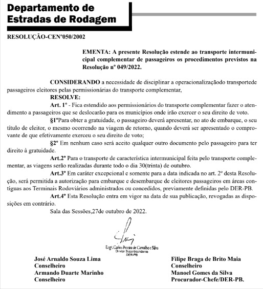 Ainda segundo o decreto, as viagens deste tipo de transporte serão realizadas apenas durante o dia 30 de outubro. Uma outra decisão é que excepcionalmente no domingo será permitida a autorização para embarque e desembarque de eleitores passageiros em áreas comuns dos terminais rodoviários administrados pelo DER-PB ou sob concessões (terceirizados).