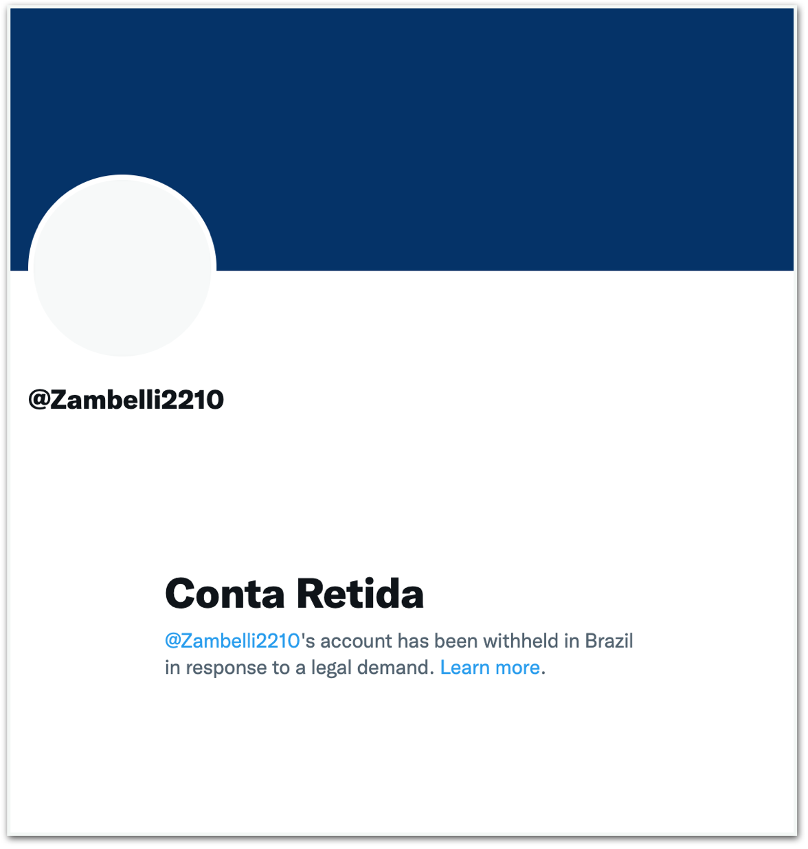 Ao tentar acessar o perfil da congressista nas redes sociais, lê-se a seguinte mensagem: “A conta de @Zambelli2210 foi retida no Brasil em resposta a uma demanda legal”.