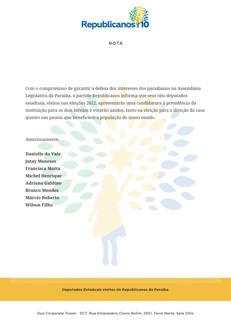 “Com o compromisso de garantir a defesa do interesses dos paraibanos na Assembleia Legislativa da Paraíba, o partido Republicanos informa que seus oito deputados estaduais eleitos nas Eleições 2022, apresentarão uma candidatura à presidência da instituição para os dois biênios e votarão unidos, tanto para eleição para a direção da casa quanto nas pautas que beneficiem a população do nosso estado” informa a nota.