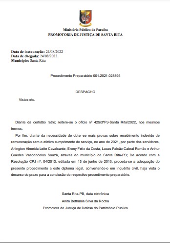 A Promotora de Justiça de Defesa do Patrimônio Público, Anita Bethânia Silva da Rocha, instaurou em agosto um inquérito para investigar os servidores Arlington Almeida Leite Cavalcante, Erony Felix da Costa, Lucas Falcão Cabral Romão e Arthur Guedes Vasconcelos Souza.