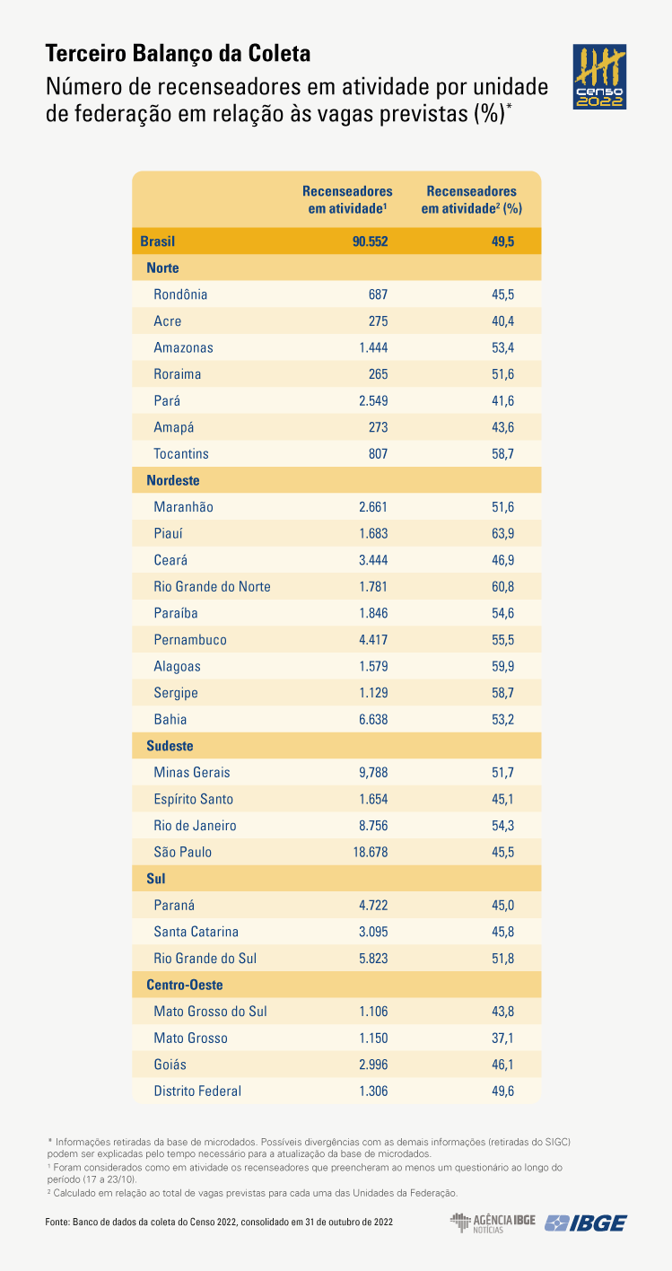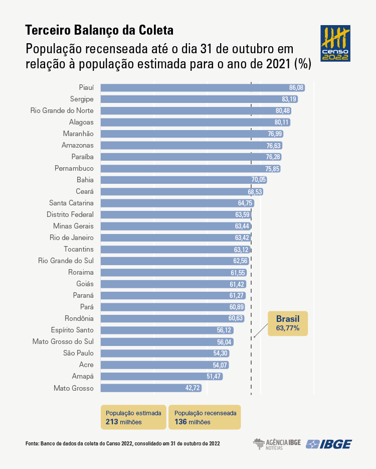 O IBGE (Instituto Brasileiro de Geografia e Estatística) divulgou nesta semana o 3º balanço da coleta do Censo Demográfico 2022. Desde o início da operação, em 1º de agosto, até o dia 31 de outubro, foram recenseadas 136.022.192 pessoas, em 47.740.071 domicílios no país. Destas, 31,69% estavam na região Nordeste, 38,45% no Sudeste, 13,99% no Sul, 8,88% no Norte e 6,99% no Centro-Oeste. Até o momento, 48,3% da população recenseada eram homens e 51,7% eram mulheres.