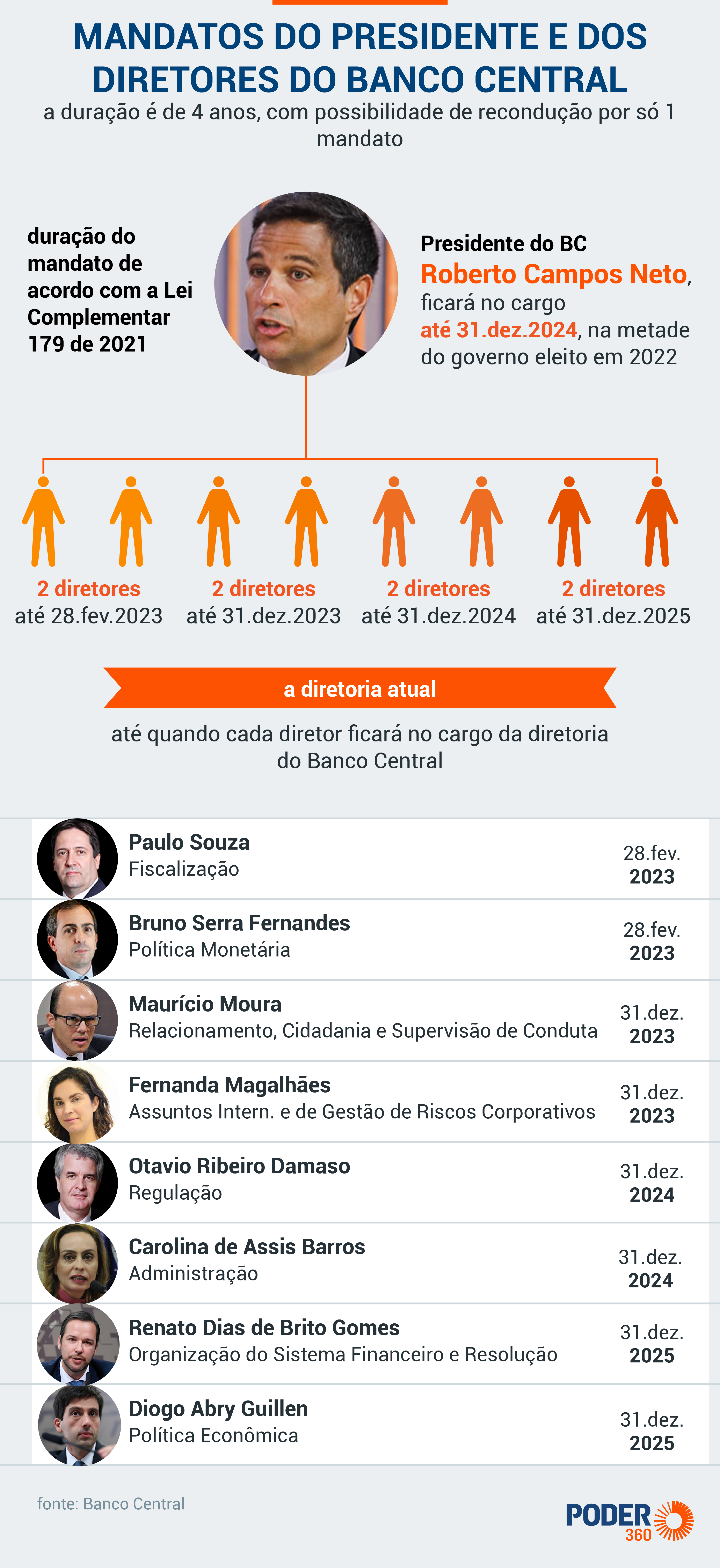 Dos 8 diretores que estão hoje na autoridade monetária, até 4 poderão ser substituídos no governo Lula em 2023. Além de Paulo Souza e Bruno Serra Fernandes, acabará o 1º mandato de Maurício Moura (Relacionamento, Cidadania e Supervisão de Conduta) e de Fernanda Magalhães (Assuntos Internacionais e de Gestão de Riscos Corporativos).