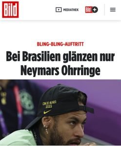 “Só Neymar brilha na exibição sem gols contra Camarões! A superestrela sul-americana só consegue olhar magoada, mas convence com estilo. Cada uma de suas orelhas é adornada com uma pequena corrente brilhante, da qual pendem três anéis menores – cravejados de diamantes”, destacou o Bild.