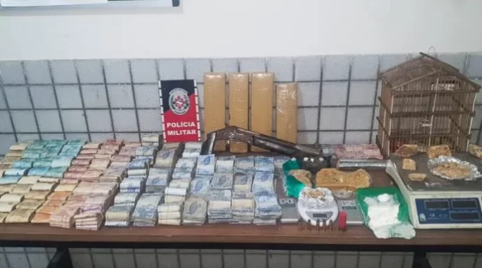 Os policiais realizavam rondas nas proximidades da pracinha no bairro do Rosário, quando perceberam um homem saindo de uma casa em atitude suspeita. Na abordagem e varredura do local, foram encontradas várias drogas, arma, munições, balanças de precisão e aproximadamente R$ 21 mil em dinheiro, evidenciando que o local era utilizado com ponto de venda de drogas na localidade.