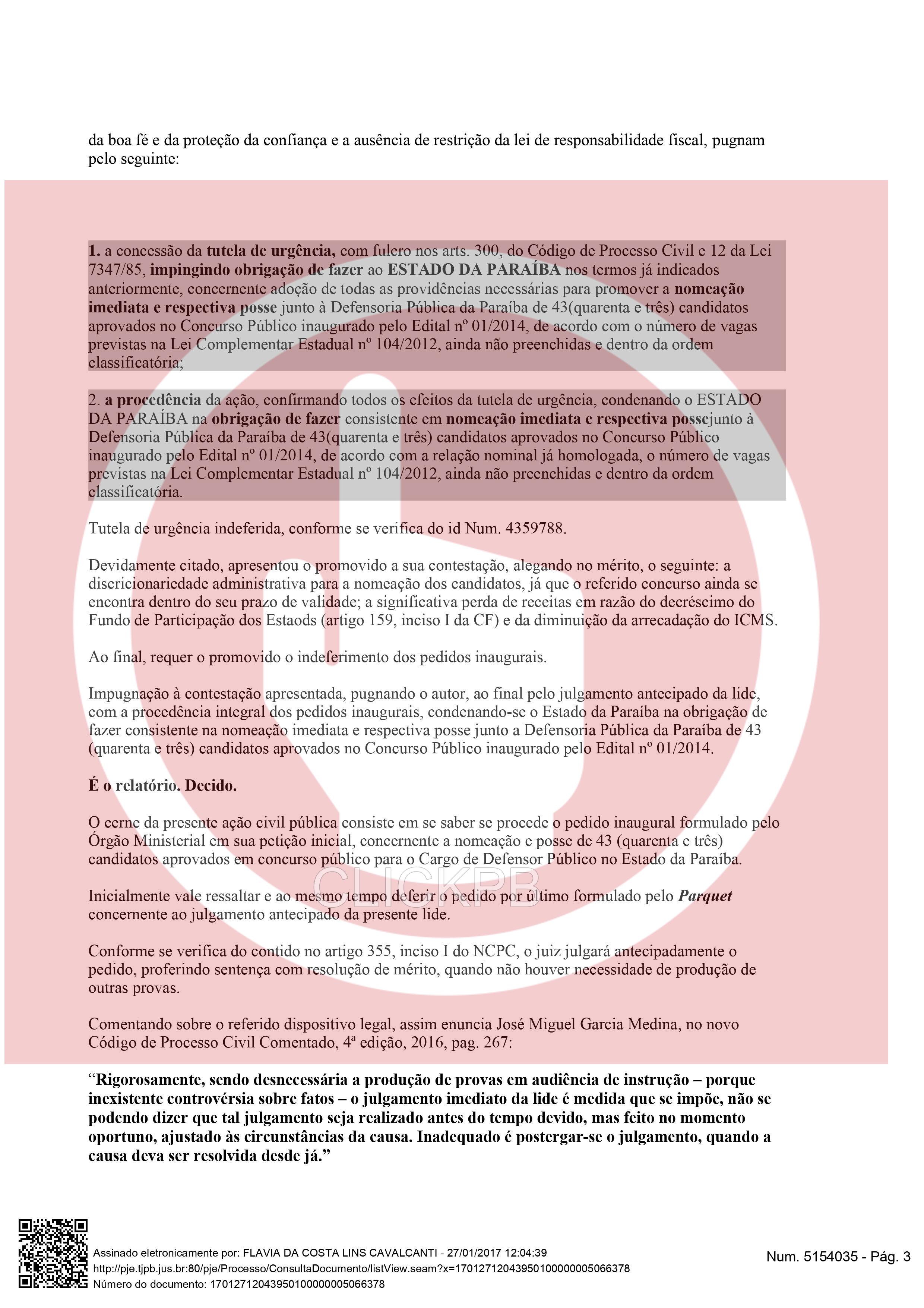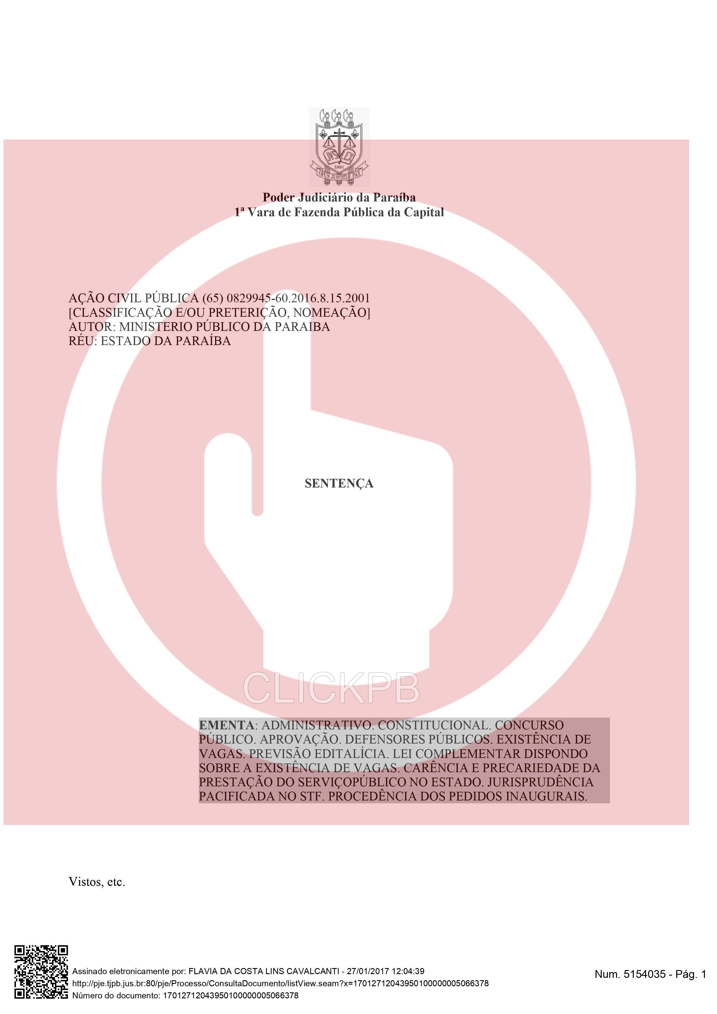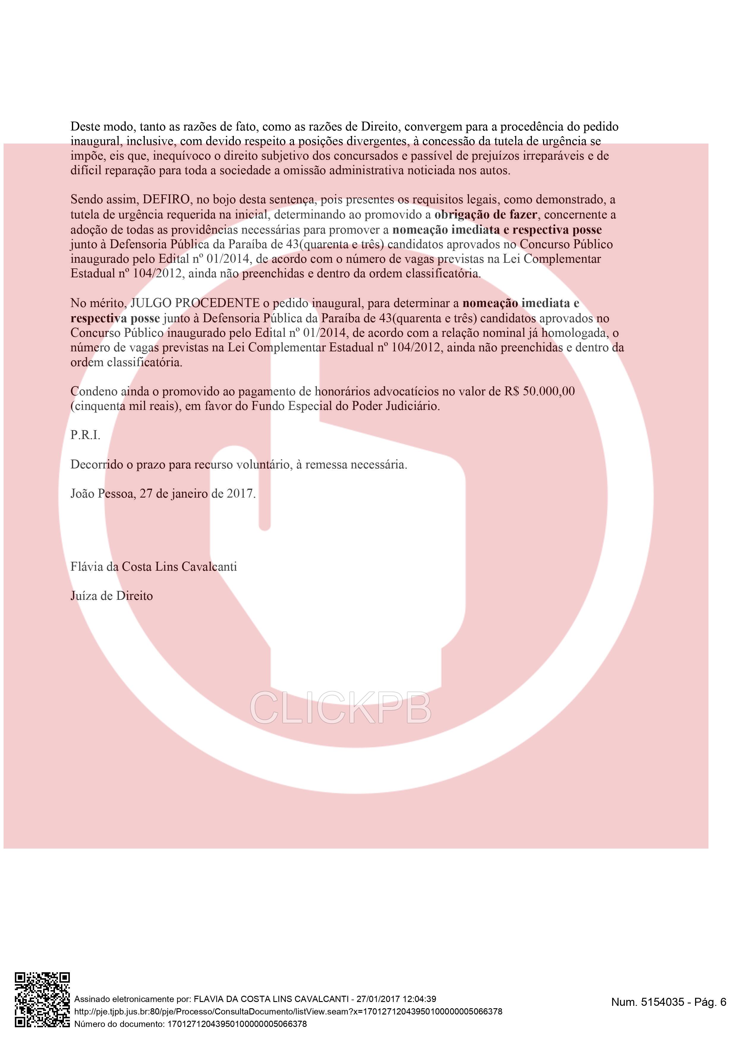 A Juíza Flávia da Costa Lins Cavalcanti deu prazo de dez dias para o Governo da Paraíba comprovar a nomeação de 43 aprovados no concurso da Defensa Pública da Paraíba, regido pelo edital nº 01/2014, de acordo com o número de vagas previstas na Lei Complementar Estadual nº 104/2012. O ClickPB obteve com exclusividade a decisão.