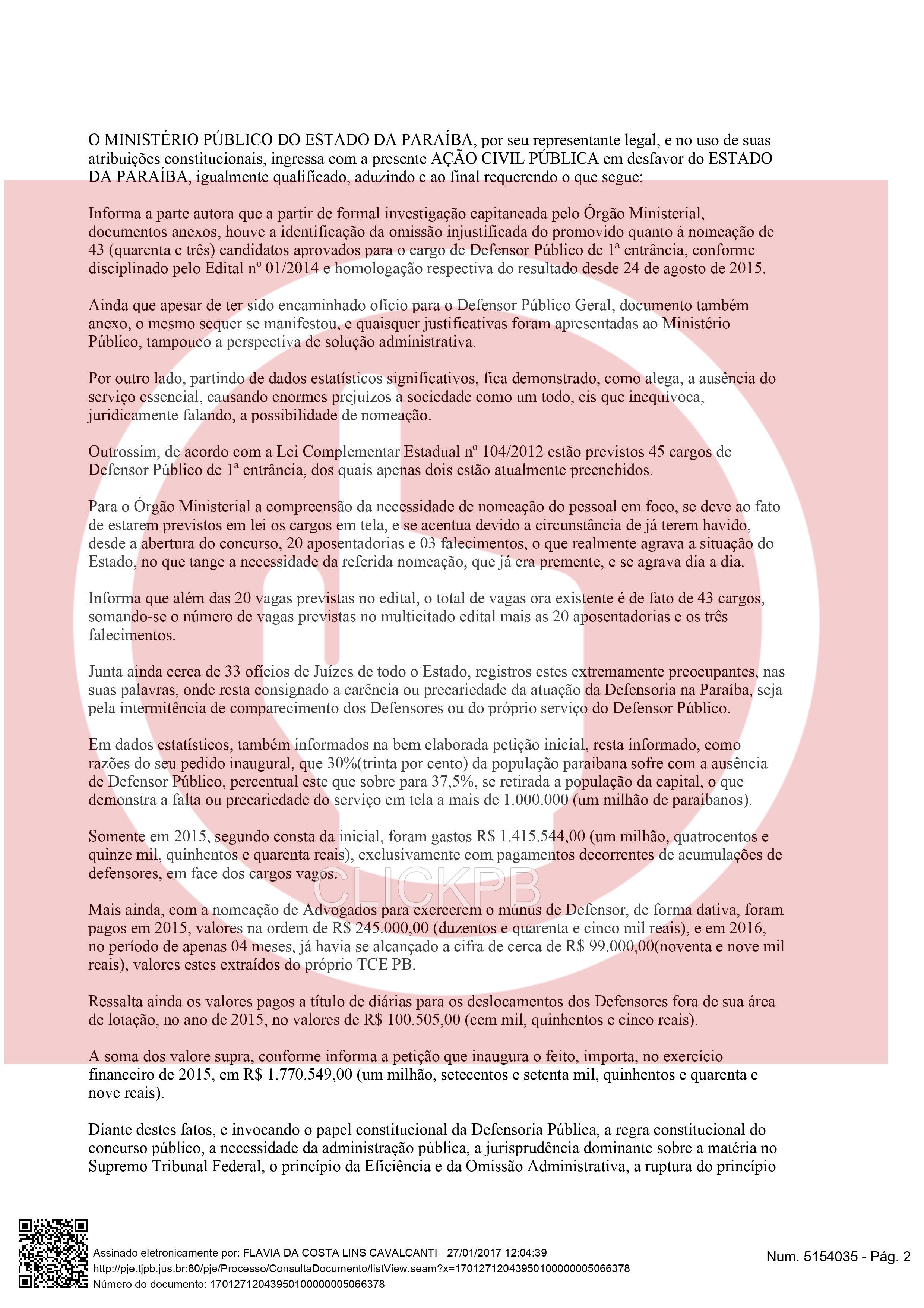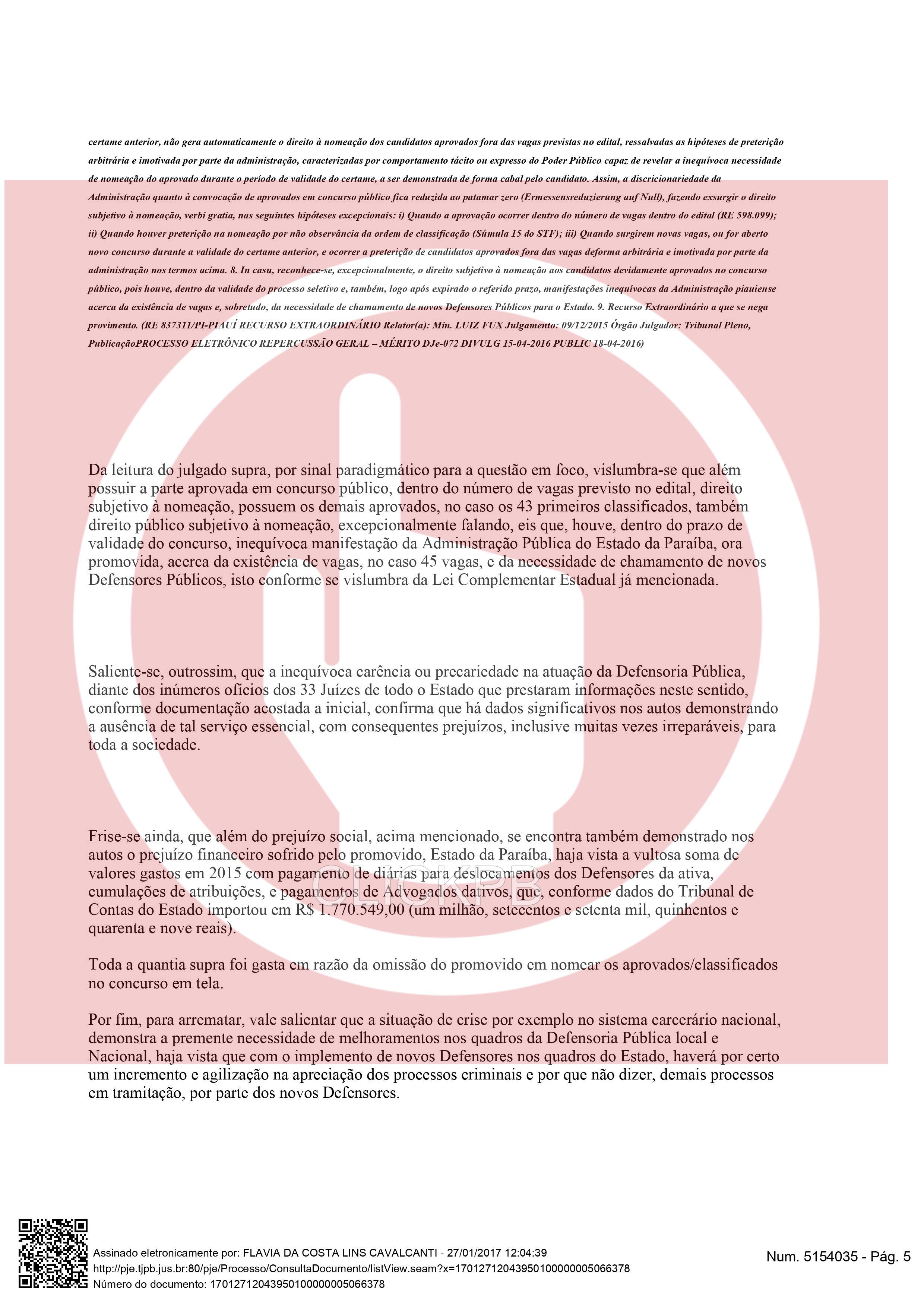 “[…] Os 43 primeiros classificados, também direito público subjetivo à nomeação, excepcionalmente falando, eis que, houve, dentro do prazo devalidade do concurso, inequívoca manifestação da Administração Pública do Estado da Paraíba, ora promovida, acerca da existência de vagas, no caso 45 vagas, e da necessidade de chamamento de novos Defensores Públicos”, diz trecho do material.