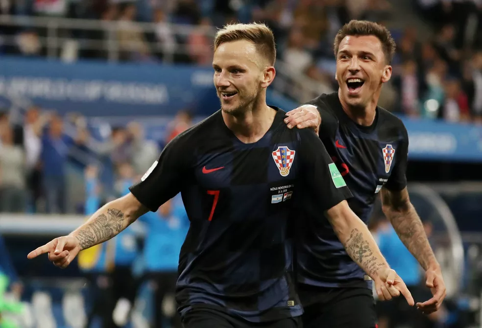 Rakitic e Mandzukic comemoram vitória de 3 a 0 da Croácia sobre a Argentina, no último jogo entre os países, na Copa 2018