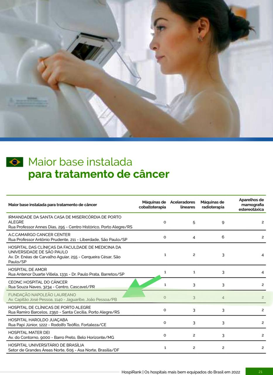 O Hospital Napoleão Laureano (HNL) é destaque em ranking internacional, o HospiRank, entre os dez hospitais oncológicos mais bem equipados do Brasil em 2022. De acordo com os dados da Global Health Intelligence (GHI), o hospital filantrópico foi eleito o 6º do Brasil e o 1º do Nordeste que possui maior base instalada para tratamento de câncer no país. O levantamento analisa a infraestrutura de hospitais públicos e privados da América Latina.