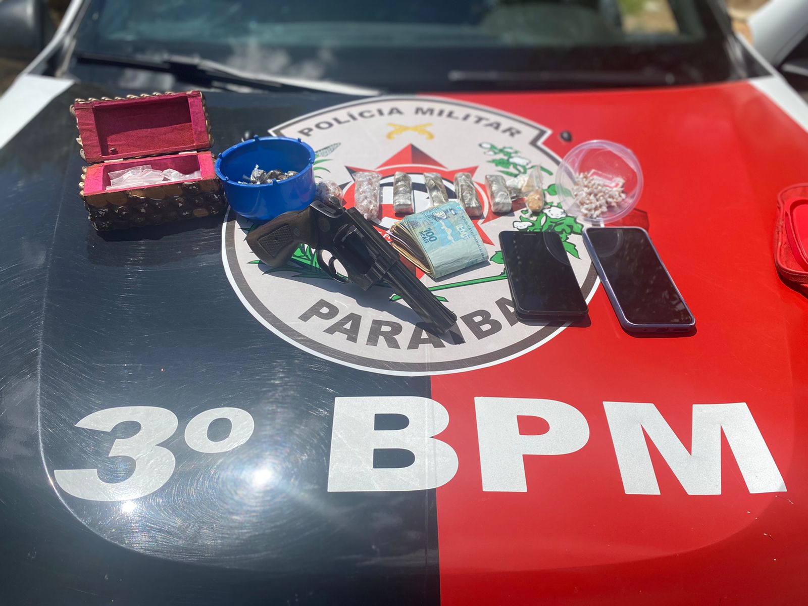 O material apreendido foi encaminhado à Delegacia de Polícia Civil. Os policiais receberam informações via 190 que os suspeitos em fuga estariam em deslocamento ao município de Patos. Foram realizadas diligências e os suspeitos foram localizados em um veículo.