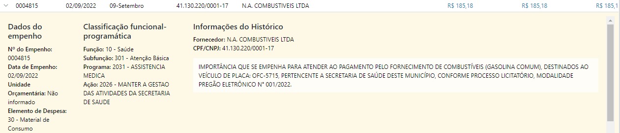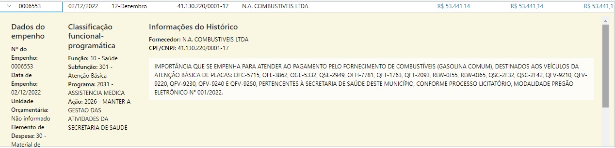 Eles variam de R$ 185,18 a R$ 53.441,14. Estas parcelas foram pagas, respectivamente, no meses de setembro e dezembro para “manter a gestão das atividades da Secretaria de Saúde”. O segundo maior valor ao longo do ano foi destinado também para a referida pasta (R$ 49.886,75), assim como o terceiro maior gasto (R$ 46.094,63).