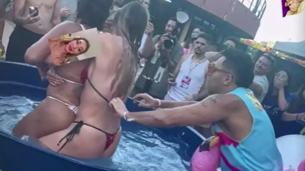 Humorista Tirullipa puxa laço de biquíni de digital influencer durante brincadeira na Farofa da Gkay — Foto: Reprodução