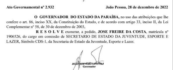 O Governador João Azevêdo (PSB) exonerou, a pedido, o secretário estadual da juventude, esporte e lazer, Zezinho do Botafogo (Cidadania). Conforme apurou o ClickPB, a informação consta na edição desta quinta-feira (29) do Diário Oficial do Estado (DOE). Natural de Taperoá, José Freire da Costa, o Zezinho, foi presidente da equipe profissional do time Botafogo da Paraíba, e é bastante conhecido na área de esporte em João Pessoa.