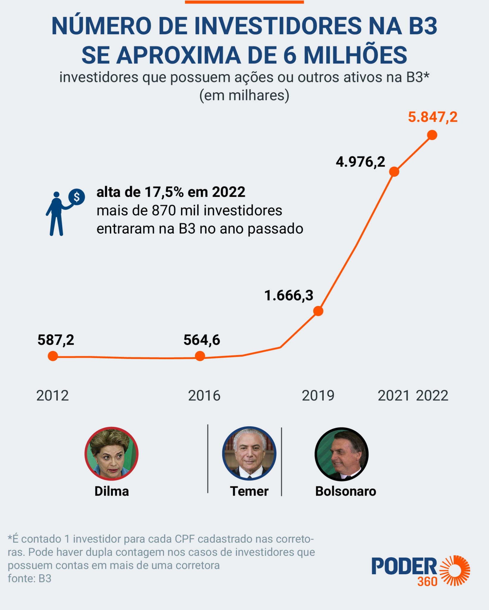 O Poder360 fez o levantamento com base em dados da B3, atualizados até 29 de dezembro de 2022. Aumentou em 4,18 milhões o número de investidores nos últimos 3 anos. É contado como 1 investidor para cada CPF cadastrado nas corretoras. Pode haver dupla contagem nos casos de pessoas que possuem contas em mais de uma corretora.